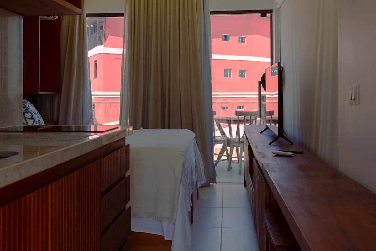 Apartamento recém construído, 100 m² de área privativa!! 50 m² entre sala-cozinha totalmente equipada com sofá-bicama e SmartTV 40¨com SKY; e suíte com cama king-size e SmartTV 4k 43''; e 50 m² de varanda com piscina particular e vista para mata atlântica. Todos os ambientes são espaçosos, climatizados e com Wi-Fi. Localizado no começo da 3°praia, a 2 min do mar, é o lugar certo pra curtir Morro; perto de supermercado, bares e restaurantes, mas em uma tranquila área residencial.