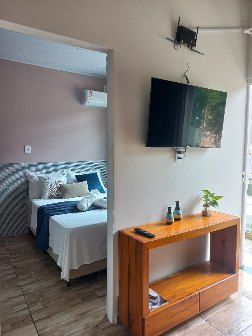 Bem-vindos! ALÉM DOS SONHOS IV é um conjugado cosy no 1ºandar com cozinha e 1 cama de casal, ar-condicionado, banheiro privativo. Localização excelente e silenciosa. 30mts da Praça Principal e 5min da 1a praia. Perto da Natureza Fornecemos enxoval completo de cama e banho e cuidamos da sua reserva do começo ao fim. *possível adicionar café da manhã à parte *temos parcerias com agencias locais para passeios e traslados *NOVO: Colocamos SMART TV :)