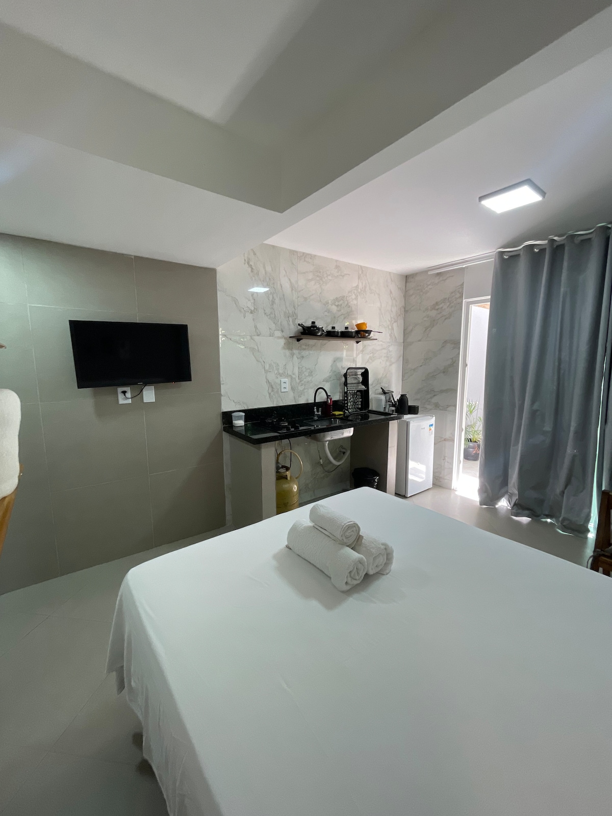 Bem-vindos! ALÉM DOS SONHOS IV é um conjugado cosy no 1ºandar com cozinha e 1 cama de casal, ar-condicionado, banheiro privativo. Localização excelente e silenciosa. 30mts da Praça Principal e 5min da 1a praia. Perto da Natureza Fornecemos enxoval completo de cama e banho e cuidamos da sua reserva do começo ao fim. *possível adicionar café da manhã à parte *temos parcerias com agencias locais para passeios e traslados *NOVO: Colocamos SMART TV :)