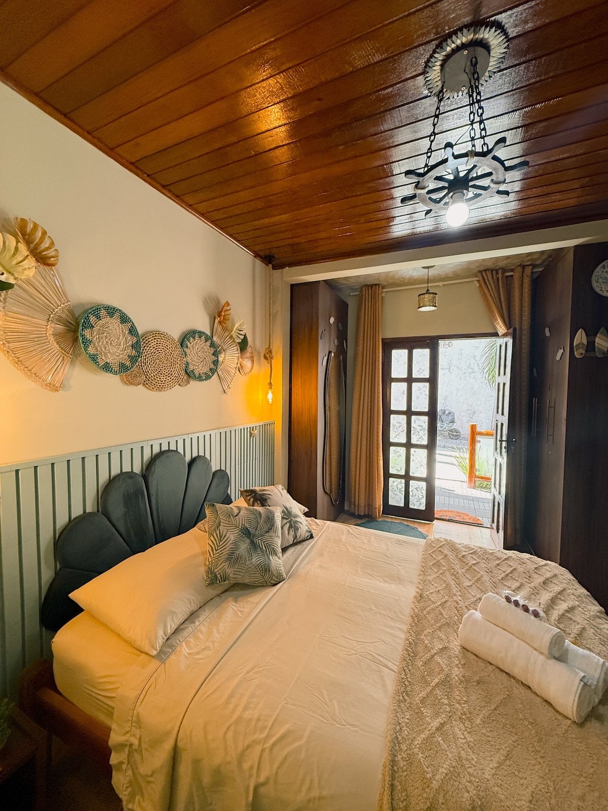 The Mandala Suite features a spacious balcony with a hammock and sofa, facing lush nature. It includes a queen-size bed, private bathroom, coffee maker, sandwich press, and ceiling fan. Located just 10 minutes from the village center and 15 minutes from First Beach, our property spans one hectare of gardens and carries over 30 years of history in Morro de São Paulo. We provide full bed and bath linens, plus soap and amenities. The entire space is beautifully decorated by Ilza, a local artisan.
