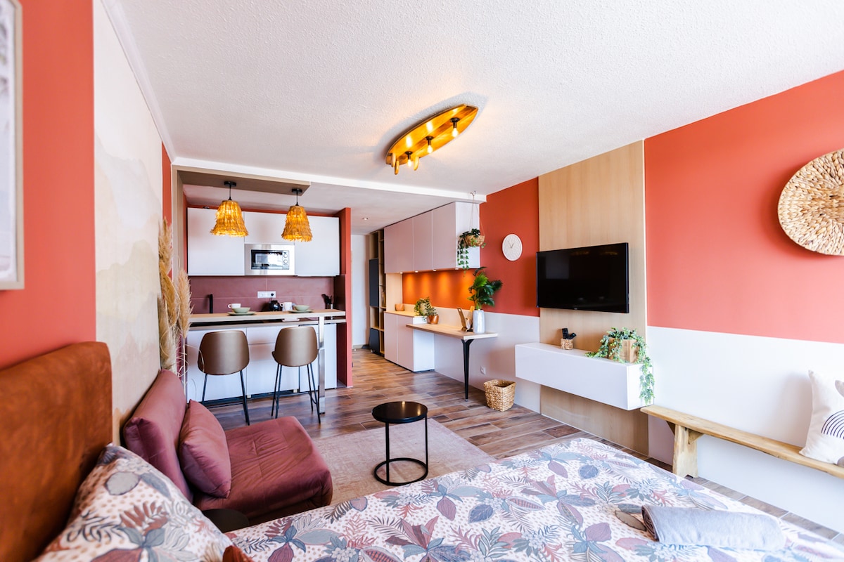 « Le 11 » est un appartement ⭐️⭐️⭐️⭐️ dédié aux voyageurs souhaitant un haut niveau de standing ainsi qu’une conception innovante et atypique. Il se compose d’une chambre avec un grand lit fixe (160/200) avec sa salle de bain attenante et ouverte sur une douche italienne, d’une cuisine équipée, d’une terrasse de 15m2 privative et d’une place de parking sécurisée. Il est également équipé d’une grande TV 4K avec le service de streaming NETFLIX connecté 🍿🍫🎥