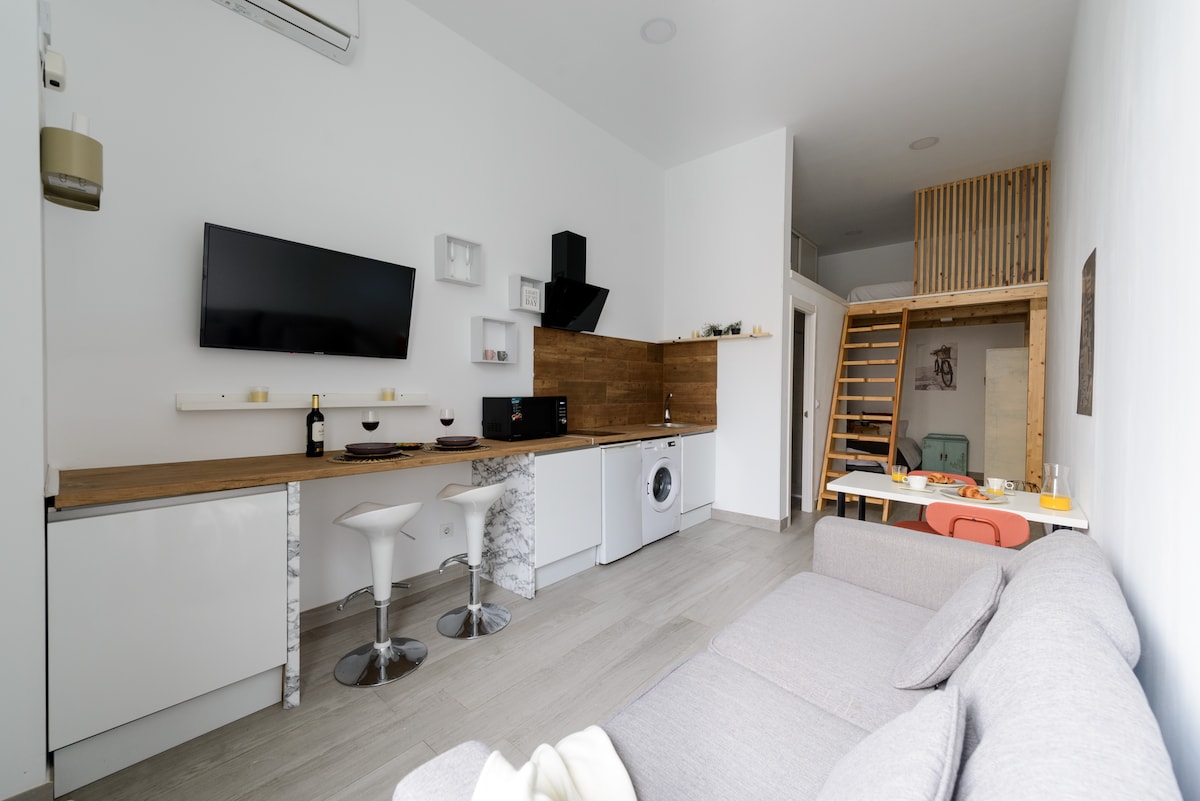 Magnificent 45 square meter apartment in the heart of Madrid. With spectacular design and decoration, spacious areas, and high ceilings, the apartment is equipped with everything you need for your stay in Madrid. The living room has three balconies overlooking the street that provide great brightness to the flat. The bedroom has an en-suite bathroom and a work desk. From the apartment, you can walk to almost all the iconic points of Madrid.