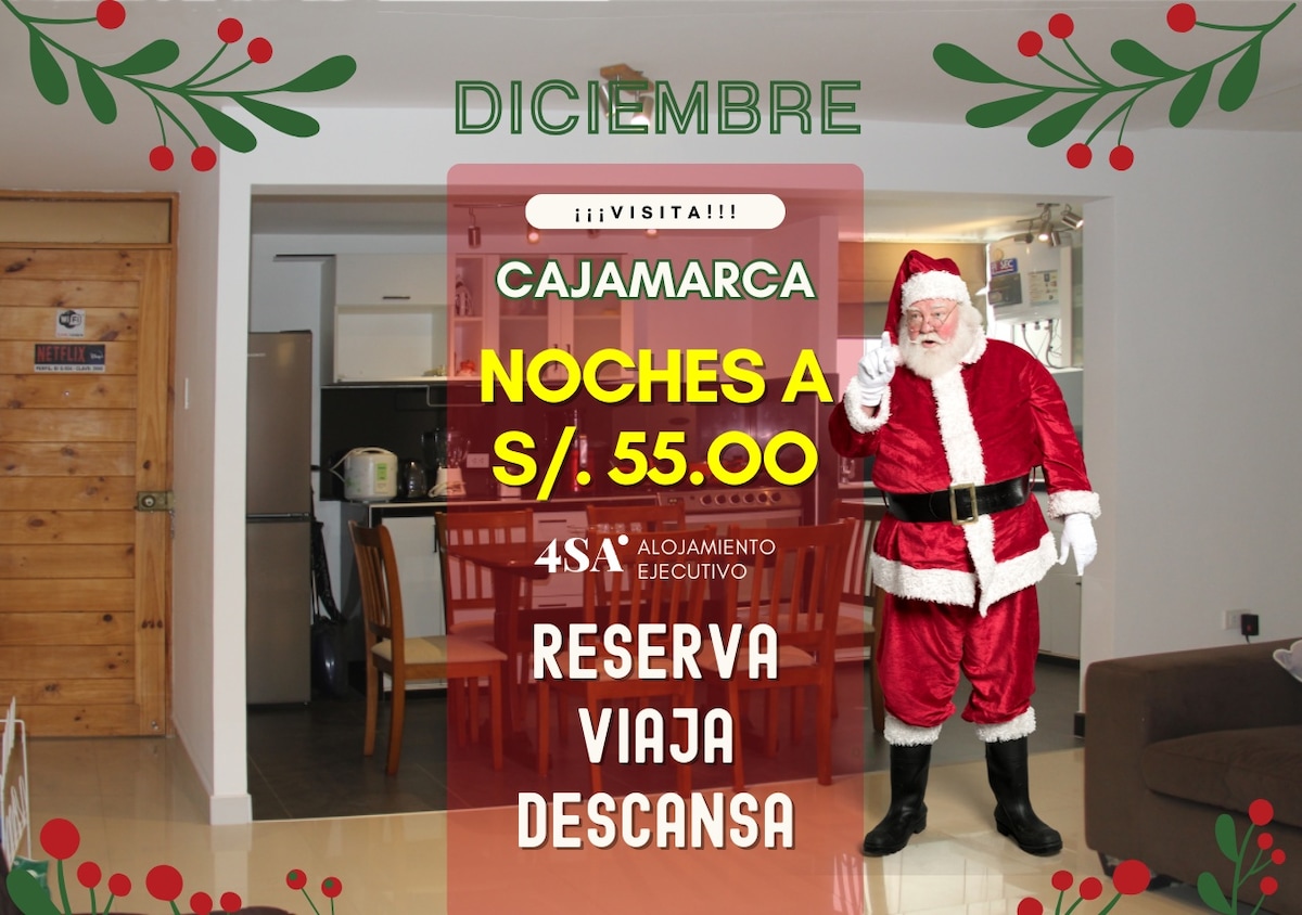 Departamento ideal para tu grupo de amigos, que visitan Cajamarca y todos sus atractivos. Tenemos Estacionamiento bajo techo en las instalaciones y seguridad 24/7. 3 habitaciones y 2 baños. Agua caliente en todas las llaves. Televisor de 60” y WiFi de alta velocidad. Cocina super equipada, sala amplia y comedor para 6 personas. a 3 min. de la plaza de Armas.