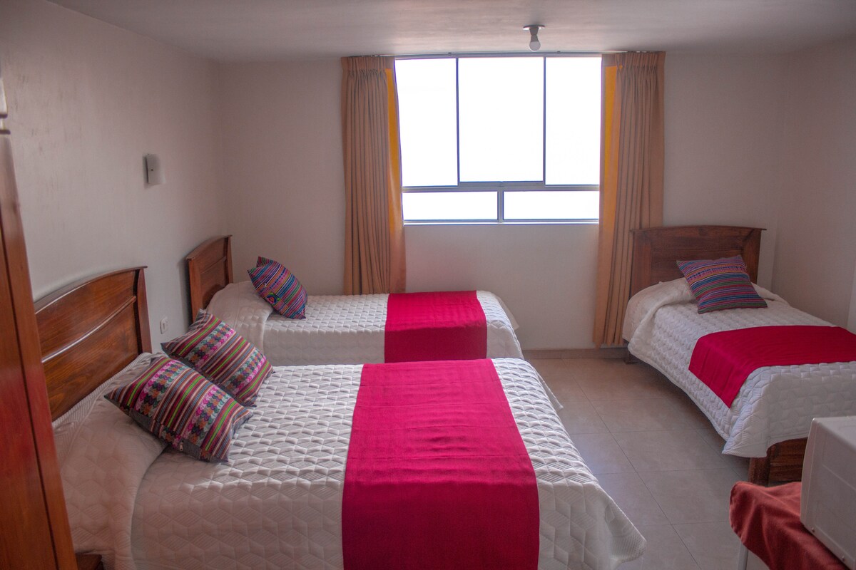 Somos un hostal turístico ubicado en Cajamarca, nos encontramos en el centro de la ciudad muy cerca a restaurantes, parques, áreas turísticas, agencias de turismo, iglesias, discotecas, bares, tiendas y mercados. Ideal para venir solos, en pareja, familia y amigos, contamos con paquetes turísticos para que conozcan nuestra hermosa ciudad. Cajamarca se encuentra en el norte del Perú, es un área montañosa lleno de naturaleza y paisajes increíbles. Este anuncio promociona la habitación matrimonial.