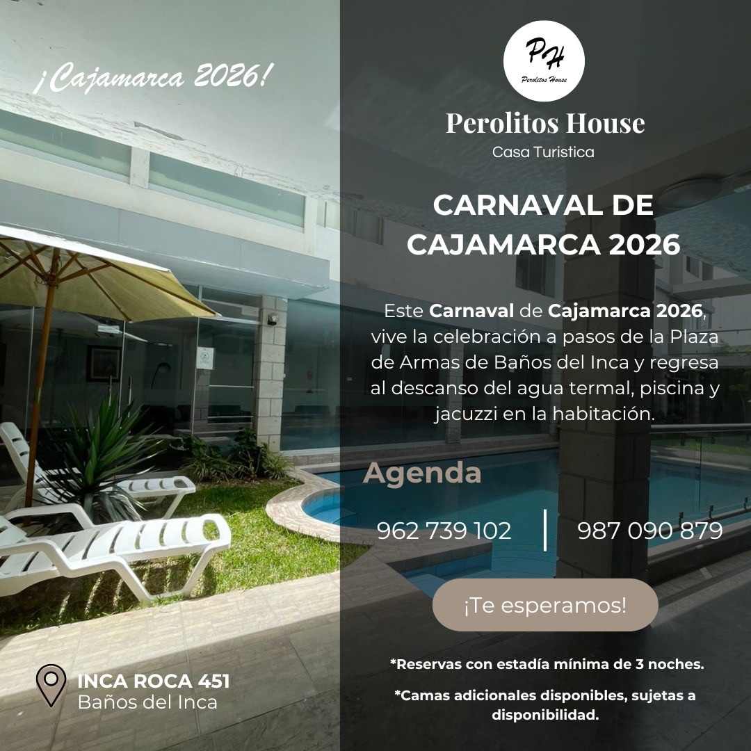 Relájate en este espacio tranquilo y elegante, frente al centro turístico de Baños del Inca de Cajamarca. Disfruta de Cajamarca y su paisaje y atractivos turísticos. El espacio: El departamento cuenta con una amplia sala y cocina integrada completa con terraza y vista al complejo turístico. cuenta con 03 habitaciones . 3 1/2 baños (Tina con hidromasajes en el baño principal y tina simple en segundo baño) Otros aspectos a destacar Cualquier daño en la propiedad será cobrado fuera del hospedaje.