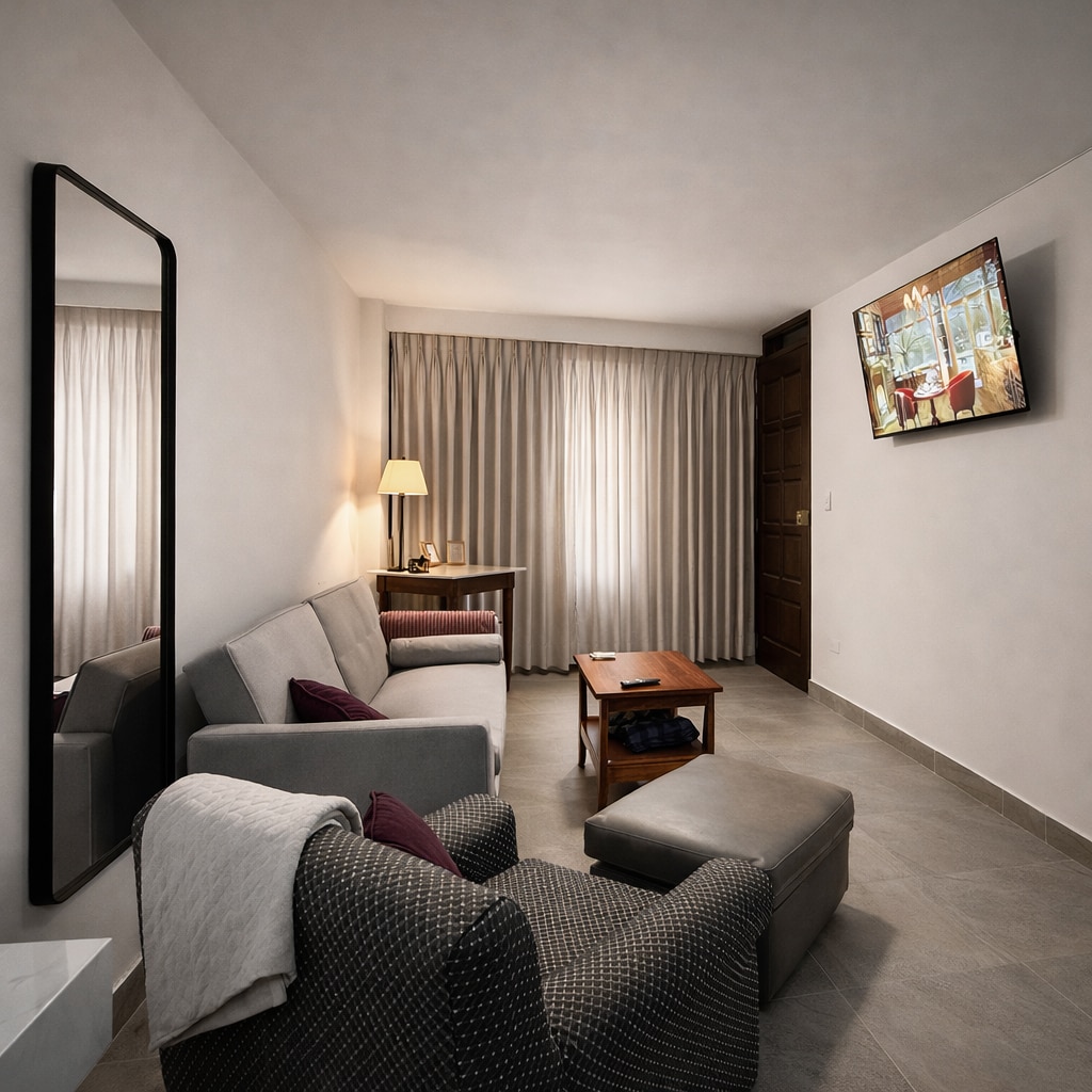 Hospédate en una habitación cómoda para 2 personas (baño compartido) en el centro histórico de Cajamarca, a solo 5–7 minutos a pie de la Plaza de Armas. Comparte baño únicamente con una habitación adicional, siendo una opción práctica para quienes priorizan buena ubicación y presupuesto sin sacrificar tranquilidad. Ideal para turistas y profesionales en comisión. Contamos con tarifas especiales para estadías semanales y mensuales.