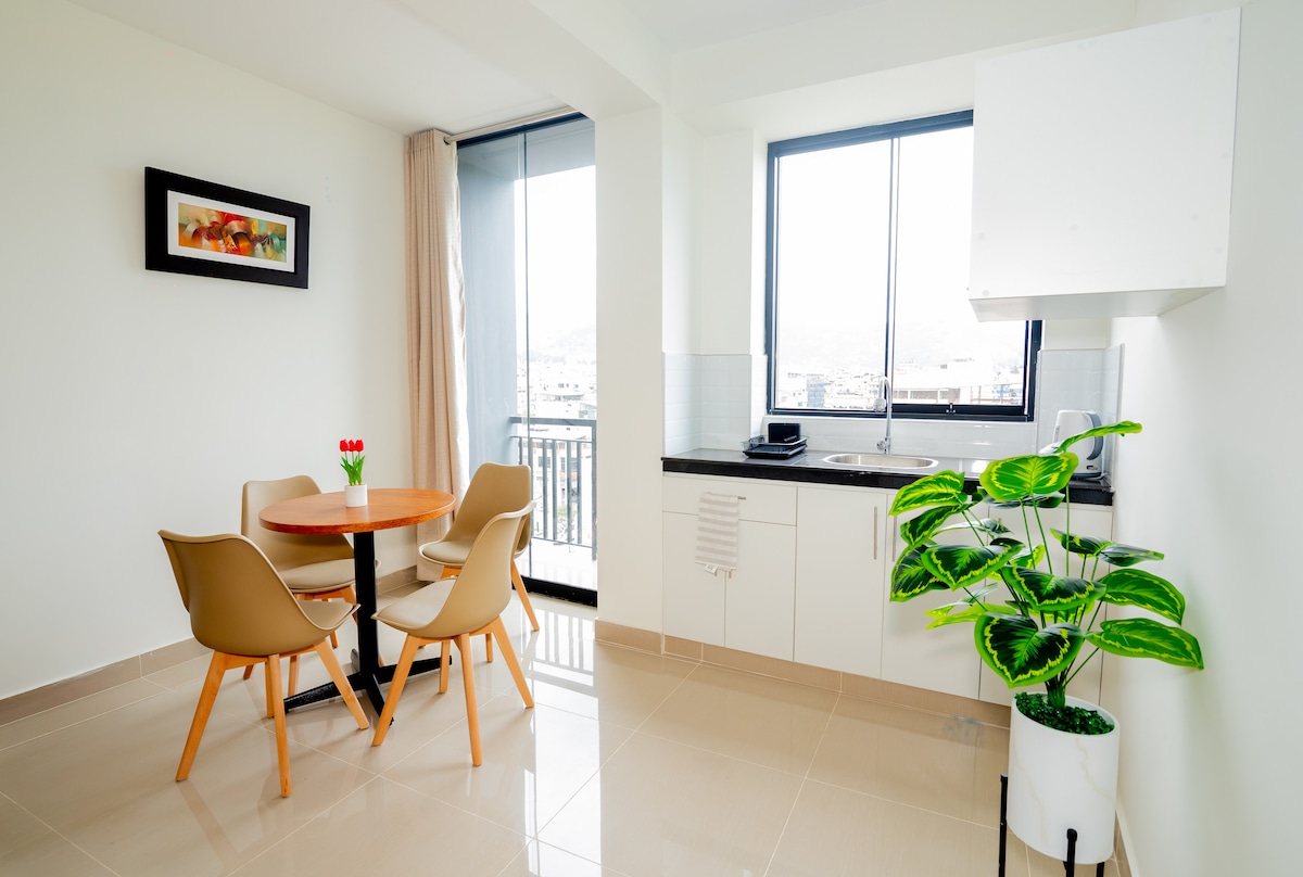Disfruta de la tranquilidad en este moderno y práctico departamento estudio de estreno con excelente iluminación natural y artificial e implementado con todo lo necesario para experimentar una confortable estadía en la mejor zona urbano residencial céntrica y segura de Cajamarca. Agua caliente en todas las llaves; cocina totalmente equipada con artefactos y utensilios, acceso a wifi de alta velocidad y tv de 59”.