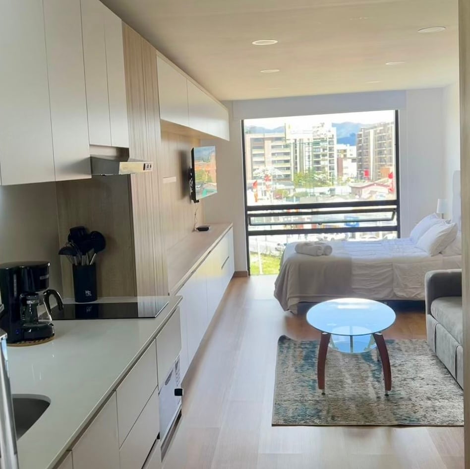 Enjoy a stylish experience in this new studio apartment of 323 ft2. Fully furnished and equipped with a washer-dryer, kitchen, refrigerator, Smart TV, WiFi, Queen bed, dining room and modern work and relaxation areas in the building. Beautiful view of the mountains of the eastern savannah of Bogotá.