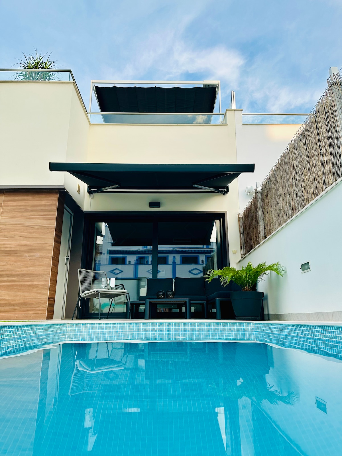 Centrally-located house at La Zenia Beach in a closed community area. Pool access. 2 bedroom modern house on 2 floors. Sun terrace with toldo over the whole roof and with a view. 10-15 min to walk to beach, 4 min to a grocery store and 3 min to La Zenia mall. Golf courses in 3 km distance. Great house with great location. The house is not suited and not equipped for young children. NRA and Touristic license VT-464761-A When sending booking requests please send further information about tenants.