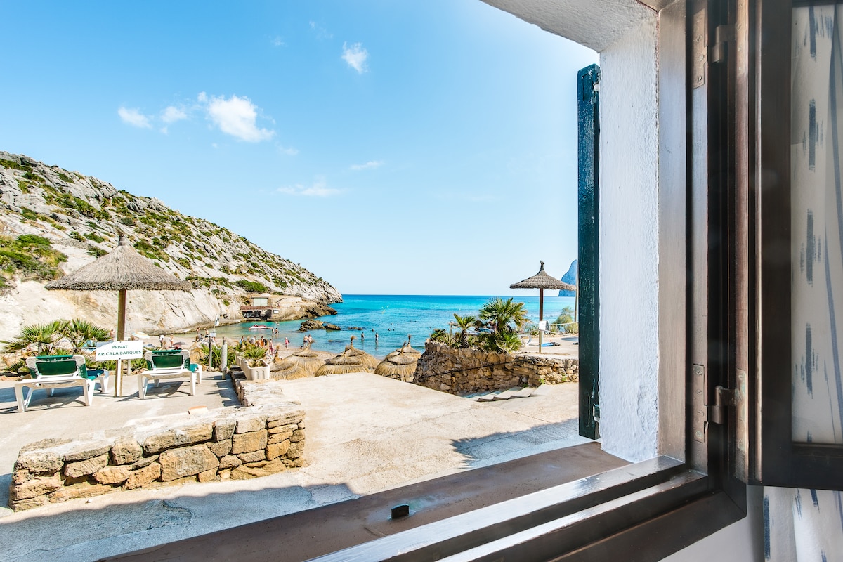 Beach Front Apartment in Cala Sant Vicenç . Modern 95 m2, 2 bedroom (queen, 2 twins), 2 full bathrooms, with spectacular Sea and Mountain View’s. 25 M2 private balcony overlooking the beautiful cove beaches. Large Pool, air conditioning in every room, private gated parking, washer/dryer, full kitchen, fully furnished.