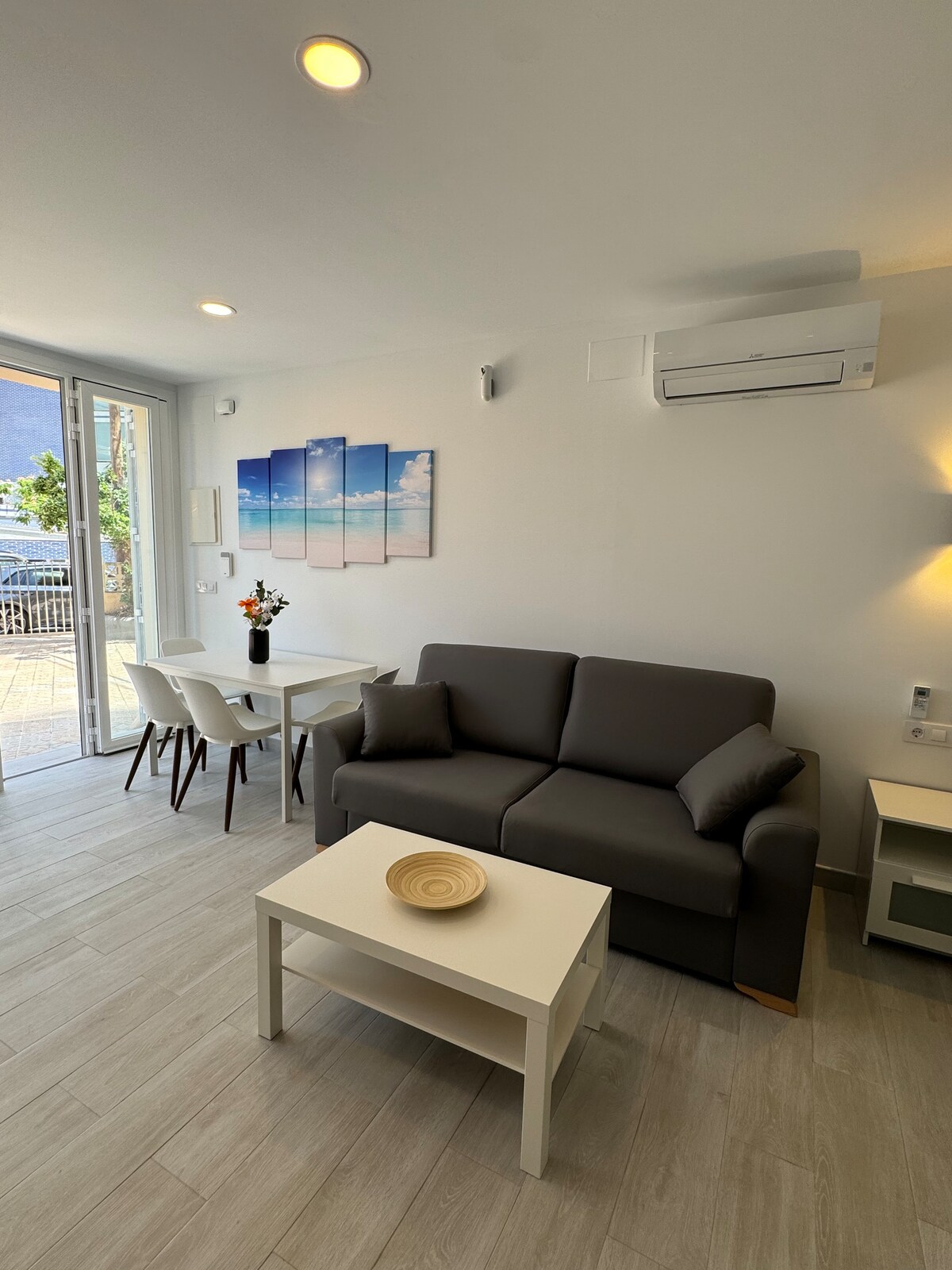 Cozy ground-floor apartment in a charming hacienda at a 10 minute walk from the beautiful Fustera beach. The hacienda is in a small gated compound with plenty of parking, a pool only available to residents or guests and a gorgeous view of the surrounding area and Mediterranean sea.