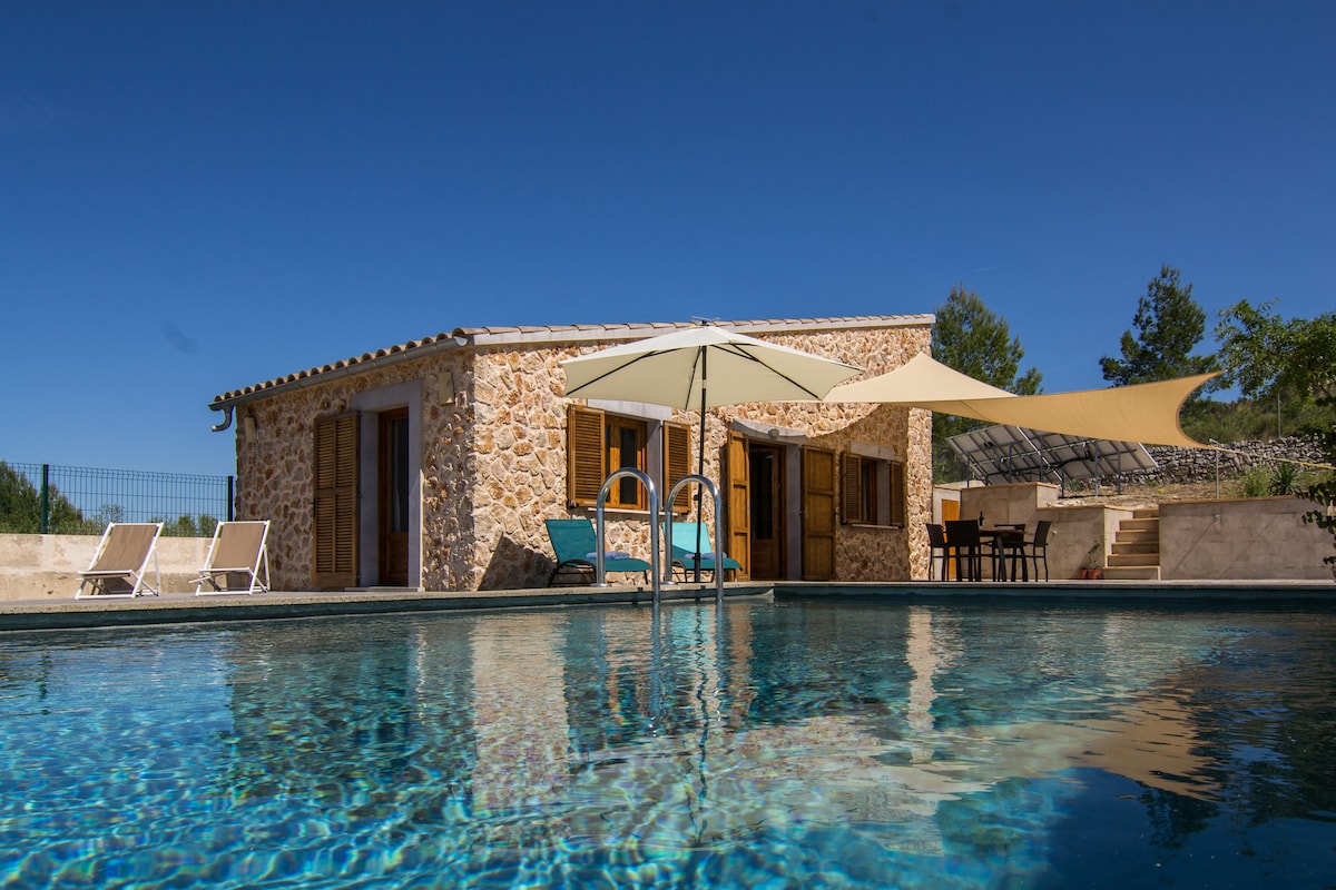 2 km outside the small village of Es Llombards/ Santanyi lies this small cosy finca for 2 persons. With a large living-dining room with kitchenette, a bedroom and a bathroom with shower, 2 people can spend a wonderful, peaceful holiday here. The outdoor area with plenty of seating and lounging options as well as sun and shade areas and an outdoor retro bathtub round off the comfort of the finca.