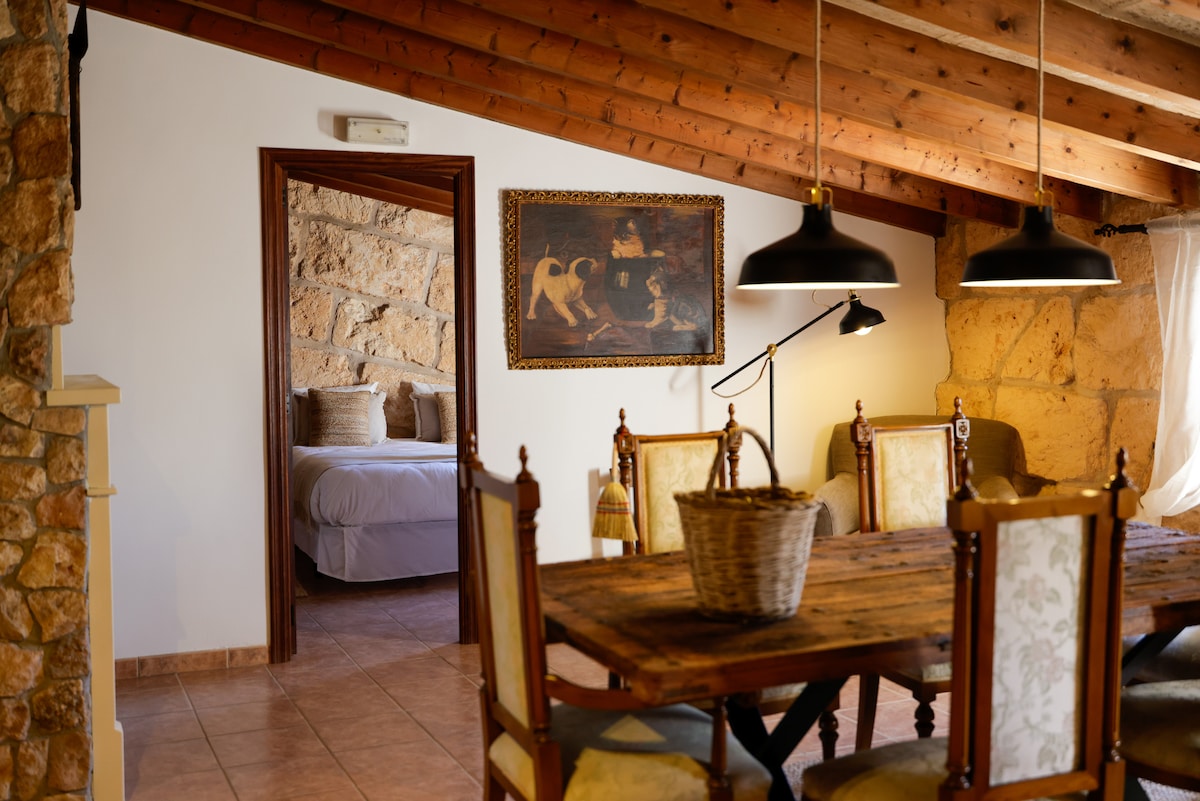 Inspired by the natural beauty of Mallorca’s countryside, this Suite (upper floor) offers a harmonious blend of rustic charm and rural simplicity. Agroturismo Finca Son Pieras (XVI century) is located in hidden Llucmajor, just 15 min from the airport & 10 min from stunning beaches. If you are looking for a place to unplug & recover you just find it. Breakfast with local & fresh products included every morning. Art Gallery, Café & Wine Bar on site. Be inspired, be creative.