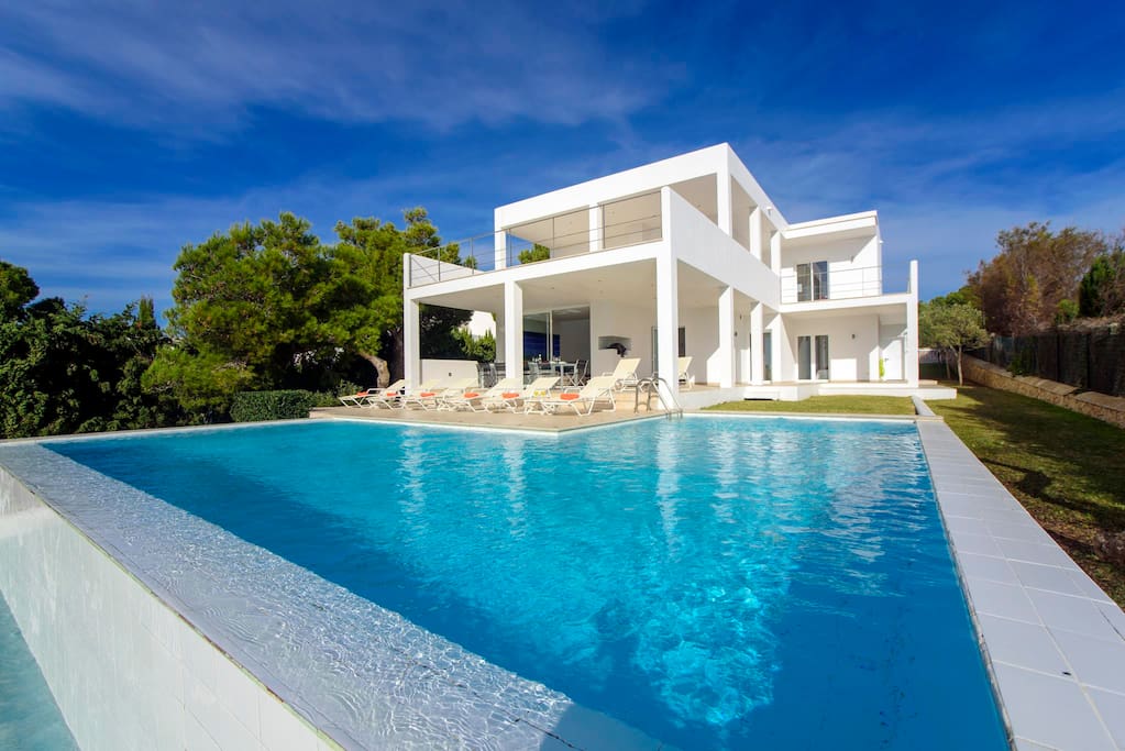 Exquisite Villa im modernen Bauhausstil: - 6 großzügige Doppelschlafzimmer - 4 davon mit eigenem Bad, 2 teilen sich ein Badezimmer - beeindruckender 23 Meter langer Pool mit Sprungbrett (bis zu 3,8 Meter Tiefe) - absolute Privatsphäre, ruhige Lage am Ende einer Sackgasse, angrenzend an ein Naturschutzgebiet - Bekannter Es Trenc Strand mit karibischem Flair nur 500 Meter entfernt - Restaurants, Geschäfte, Bäckerei und Apotheke in Laufweite Zugelassen für Ferienvermietung (Lizenznummer: ETV/14932)
