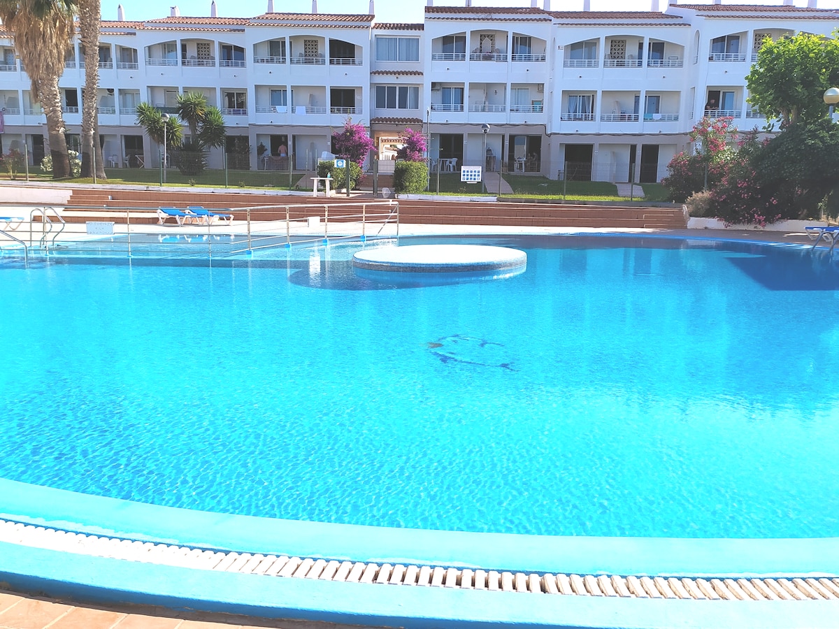 Mucha luz y bonitas y despejadas vistas Apartamento esquinero en agradable y cuidado complejo residencial que dispone de espaciosos jardines comunitarios y una gran piscina con socorrista. Está a unos 2 km de Ciutadella Aire acondicionado instalado en 2024 Tiene una habitación muy amplia con dos camas individuales y una cama nido. Salón comedor con cocina americana y sofá cama. Balcón y terraza con vistas al mar. Dispone de menaje, microondas, TV, secador de pelo, ropa de cama, toallas, wifi