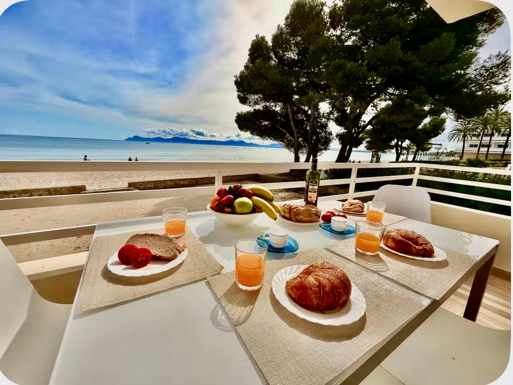 Bonito apartamento con excepcionales vistas al mar. Situado sobre la playa de arena de la Bahía de Alcudia. Cuenta con dos habitaciones dobles: una con cama doble y una con dos camas individuales. Además disponemos de un salón-comedor con acceso a una terraza con vistas al mar, cocina totalmente equipada, un baño con ducha y un aseo.