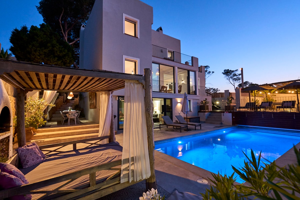 This luxurious 5-bedroom, 5-bathroom villa in Cala Vadella, Ibiza offers stunning sea and sunset views, a heated pool, and stylish interiors . Just a 5-minute walk to Cala Vadella beach with its charming bars and restaurants. Perfect for extended families and groups, it features 2 lounges, 2 kitchens, multiple chill-out areas, a garden, roof terrace, pool table, table tennis, arcade machine and baby equipment (extra children can be added) Enjoy unforgettable memories in this exquisite retreat.