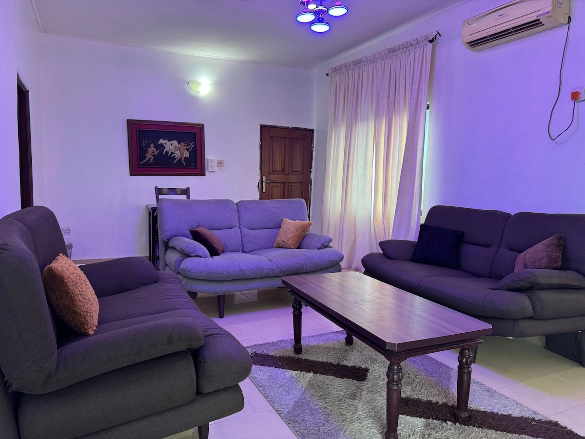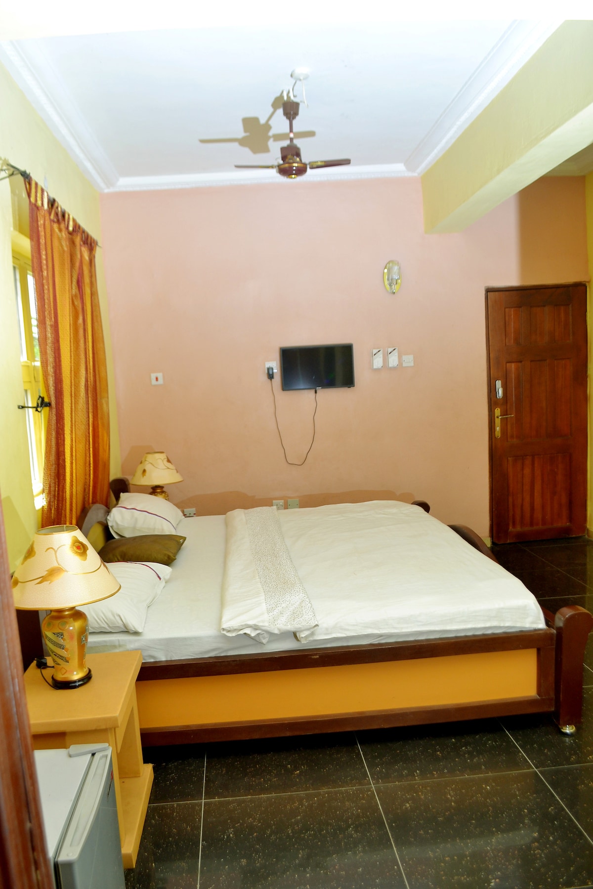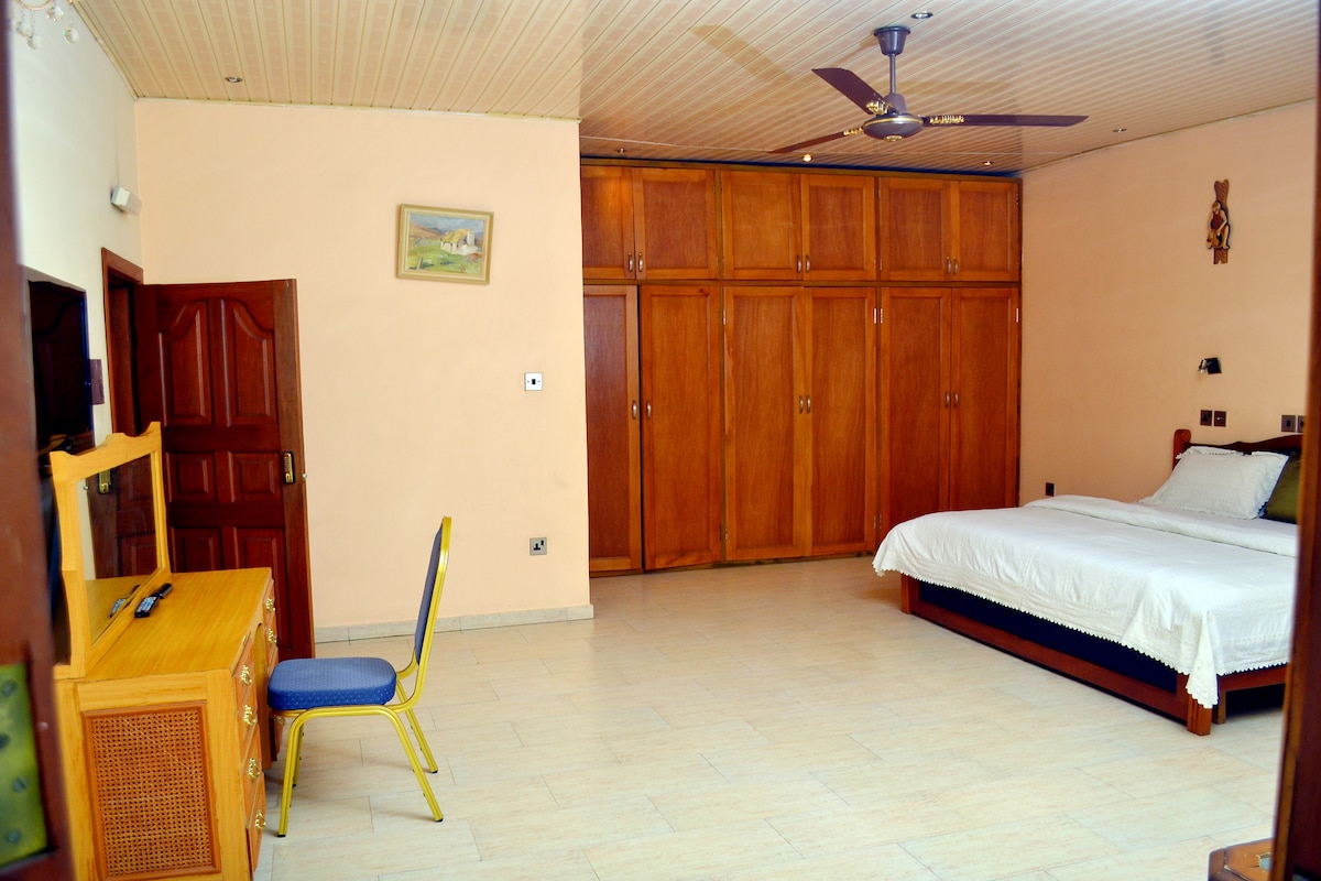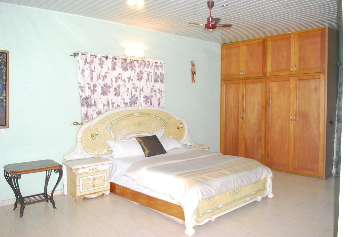 super king size bed, multiple lighting, personal balcony, shoe rooms, wardrobe and closets, desk top table, wifi, mini gym, 3 split unit ac due to the size of the room, queen size dressing mirrors, mini dinning and coffee table, 24 hours electricity, 52 inches television, 4G wifi, screen intercom, paintings and art work, water heater and a Jacuzzi.