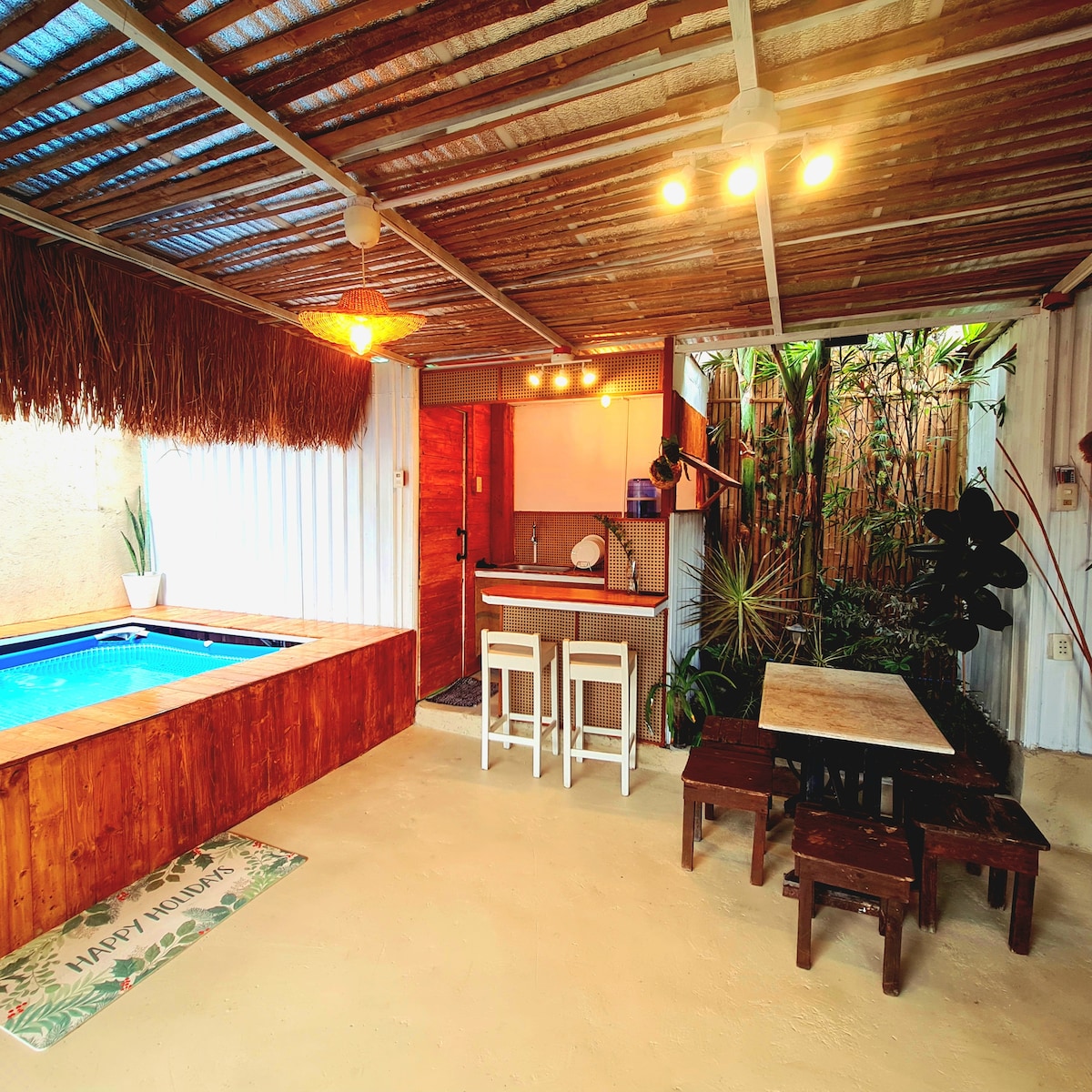 AMENITIES: ●AIR-CONDITIONED ROOMS with T&B ●VERANDA/ROOFDECK ●BEDDING, PILLOWS, TOWELS ●DIPPING TUB ●KITCHENETTE) w/ ref, microwave, elect kettle, rice cooker, stove, pots/pans, plates, glasses, utensils ●BARREL-GRILLER ●CAR-PARK ●CHECK-in & CHECK-out SHUTTLE ●BREAKFAST ●BONFIRE ●BENCH-SWINGS ●KALESA-KIOSK ●HAMMOCKS ●MASSAGE/FOOT-SPA/etc.(fee) ●MOUNTAIN TREK(fee) ●ATV/UTV/AIRSOFT RANGE(fee) ●EV CHARGING(fee) ●POOL ●Package rates for multiple nights and/or accommodations