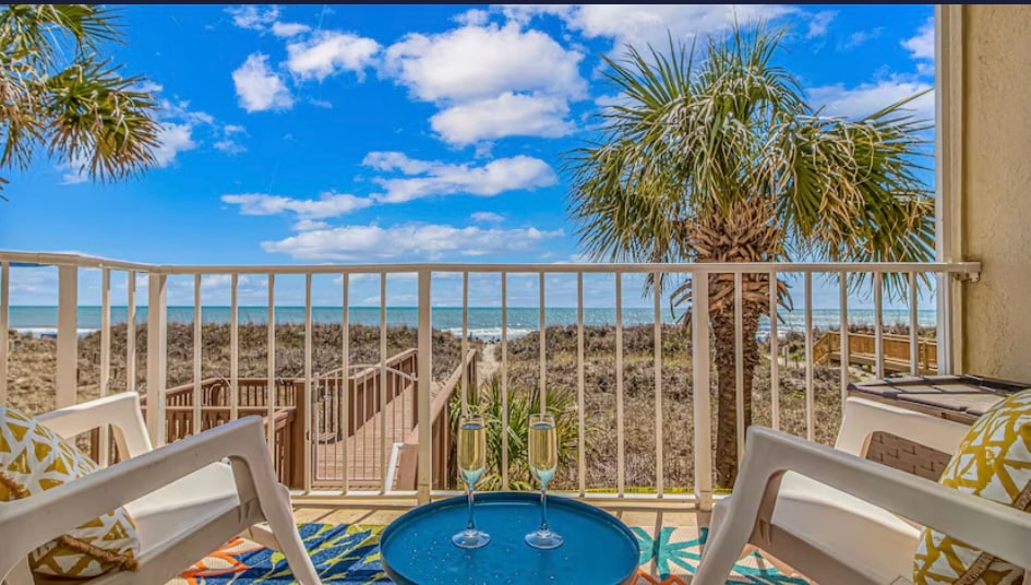 Spacious direct oceanfront corner unit with a panoramic view. Just steps from the beach and has the most amazing views of the Atlantic Ocean. Cherry Grove Beach is the absolute best area on the Grand Strand! Family friendly with lots of things do within walking distance. The building has free covered parking and 2 elevators. There is a full sized grocery store and several restaurants within walking distance. The unit is keyless entry for self check-in. Bath towels and linens are provided.