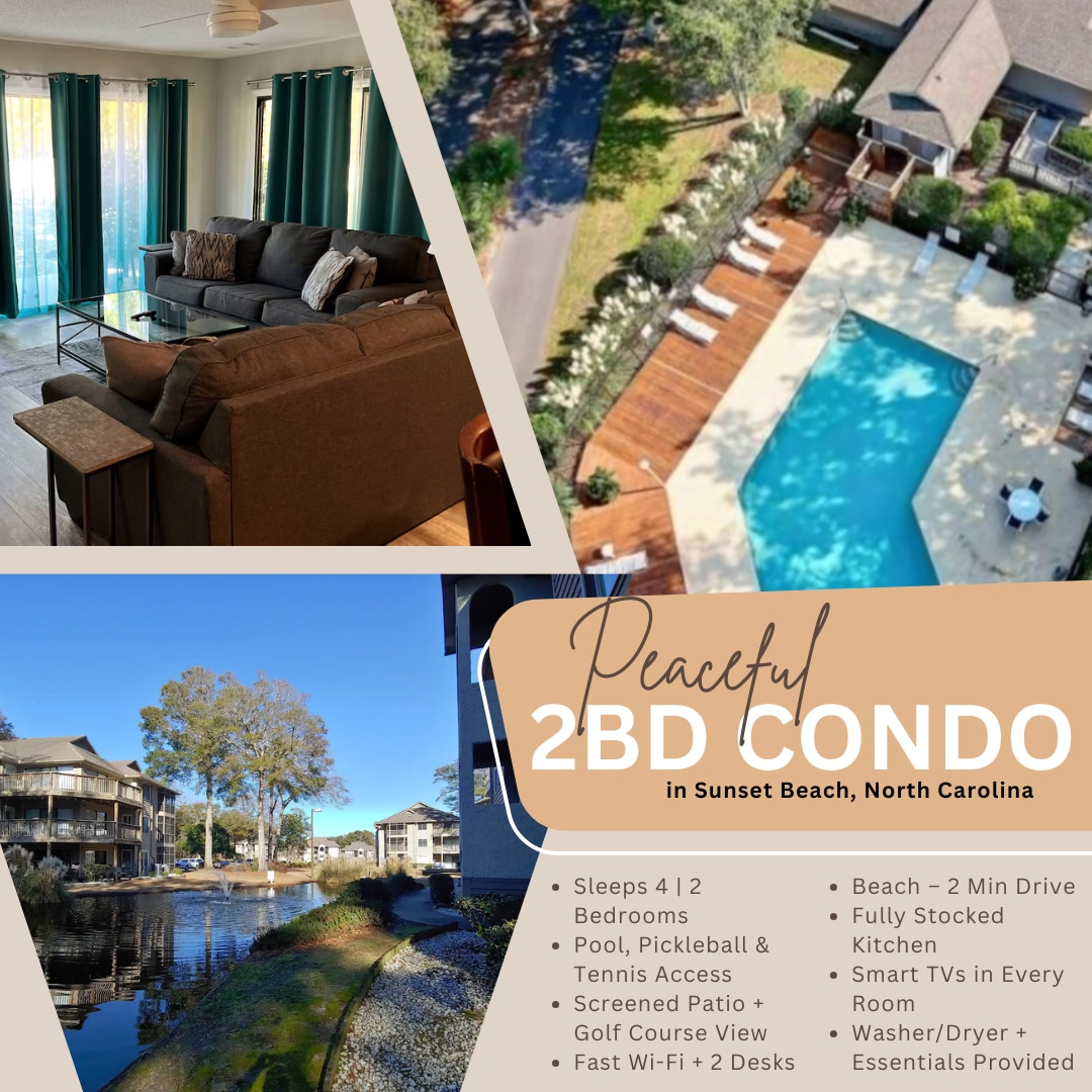 Enjoy Sunset Beach in this lovely renovated 3rd floor Condo overlooking the golf course and minutes away from the beach. The Activity Center across from the condo has a great pool with an attached restaurant and poolside bar. We are 10 minutes from Calabash which has some great restaurants and 20 Minutes form North Myrtle Beach for additional shopping and entertainment opportunities.