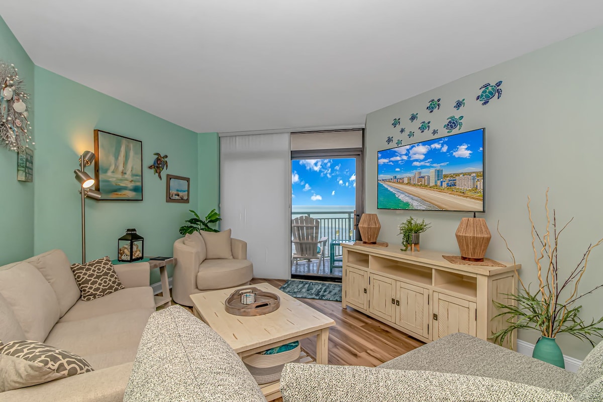 Spacious direct oceanfront corner unit with a panoramic view. Just steps from the beach and has the most amazing views of the Atlantic Ocean. Cherry Grove Beach is the absolute best area on the Grand Strand! Family friendly with lots of things do within walking distance. The building has free covered parking and 2 elevators. There is a full sized grocery store and several restaurants within walking distance. The unit is keyless entry for self check-in. Bath towels and linens are provided.