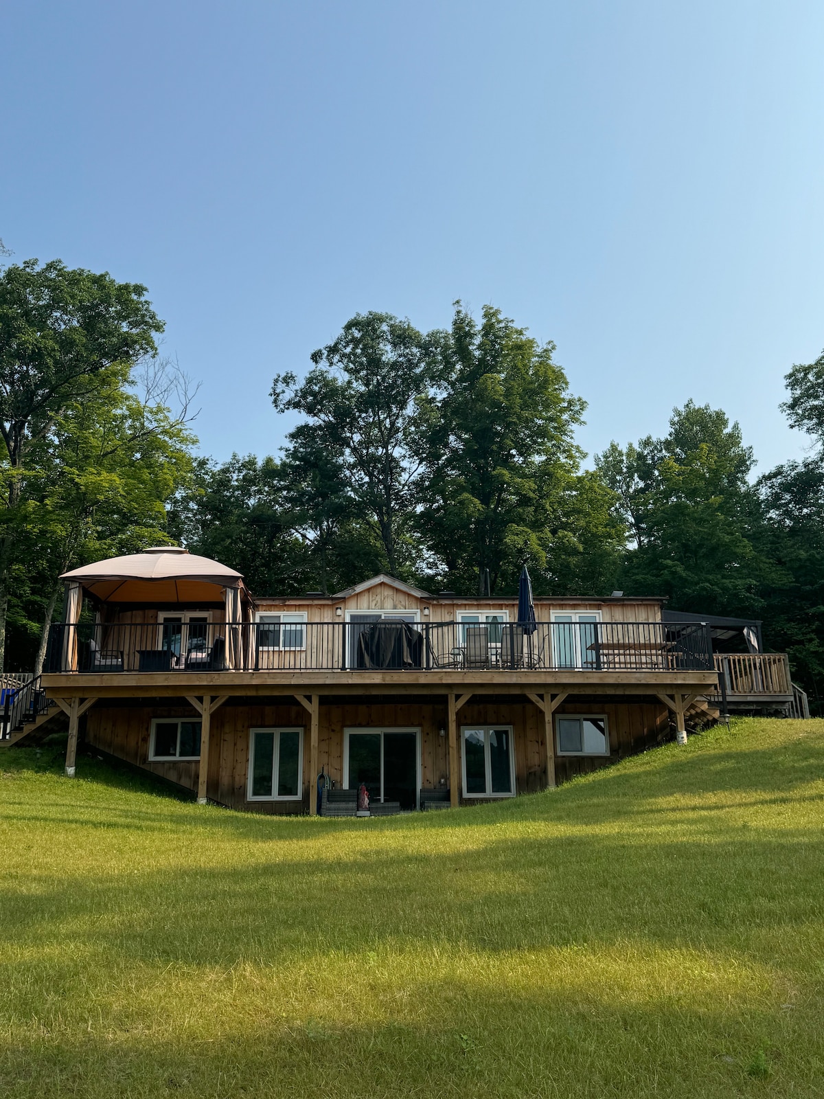 Escape to Chalet Buckingham, a stunning four-season retreat nestled on 3 acres of Ottawa River waterfront. Located just 45 minutes from Ottawa and 5 minutes from the Quyon ferry, this serene getaway is easily accessible and offers a peaceful escape from the city. Enjoy small boats and water toys in summer, cook in the large outdoor kitchen with BBQ + pizza oven, and unwind in the sheltered 8-person hot tub available year-round. Experience tranquility and adventure in one perfect destination.