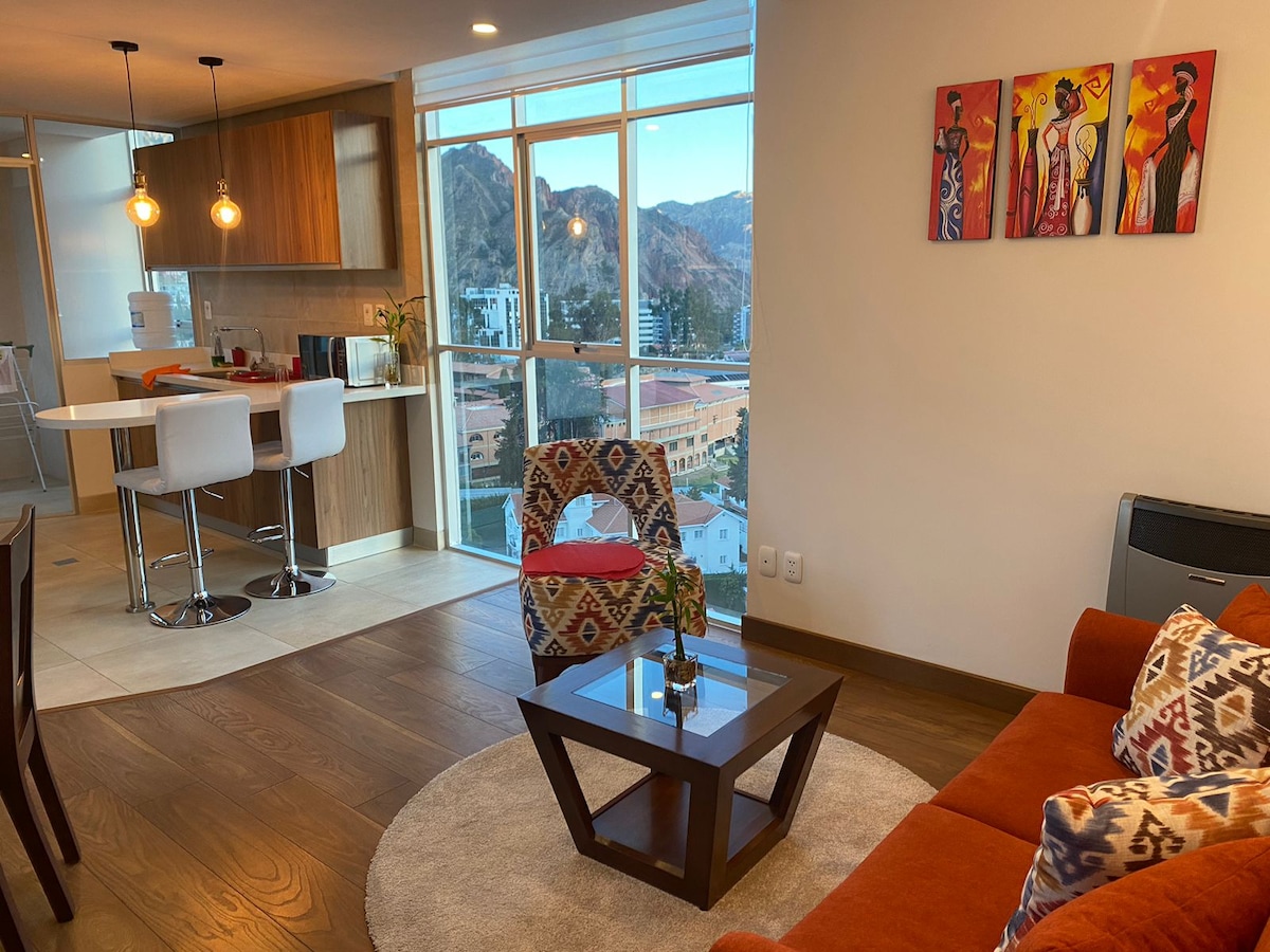Discover La Paz from in this exclusive apartment in the best area. A modern, minimalist, and cozy space for those seeking comfort and style. Wake up to an impressive view and dive into the vibrant energy of this metropolis. Fully equipped for a perfect stay, it blends luxury and warmth. Ask about our premium airport transport service and experience La Paz with comfort and sophistication.