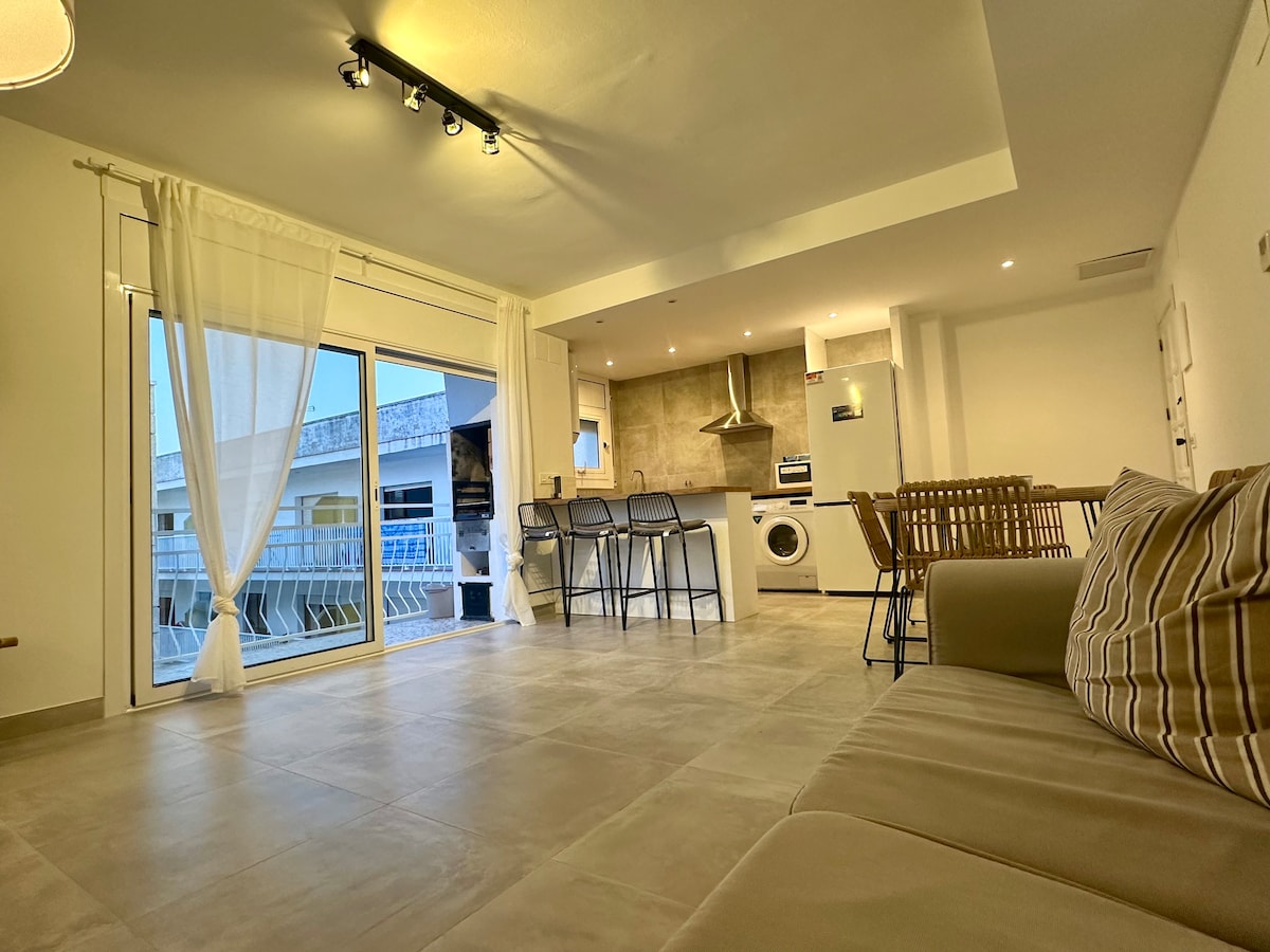 l CALAFELL 5 BEACH with WIFI and AC Air Conditioning, Soundproof windows. The apartment 75 mt from the beach Calafell, with blue flag. It consists of: 1 bedroom with double bed 150 * 190 and box spring tempur, Air AC Fujitsu, full dining room, sofa bed 2 people, folding, and cot park if needed, kitchenette, bathroom with shower-WC and washing machine. The apartment with a large terrace on a sixth floor with sea and mountain views. Theme parks of Port Aventura and Ferrari Land just 40 km away.