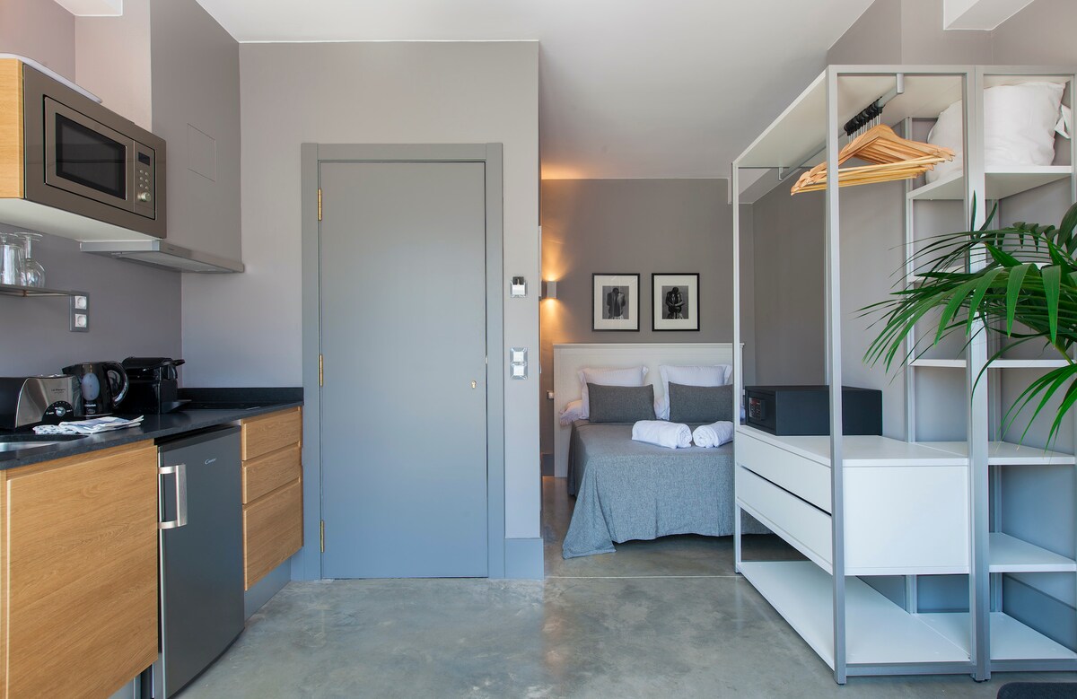 Cozy design loft for 2 people with panoramic sea views. It features a fully equipped kitchenette, dining-bedroom with a double bed, bathroom with shower, and direct access to a sunny terrace with sunbeds. The kitchen includes full utensils, Nespresso coffee machine, toaster, kettle, and a cleaning kit. The bathroom has quality products. Includes international TV, safe, air conditioning, and high-speed Wi-Fi. A warm and comfortable place for an unforgettable vacation.