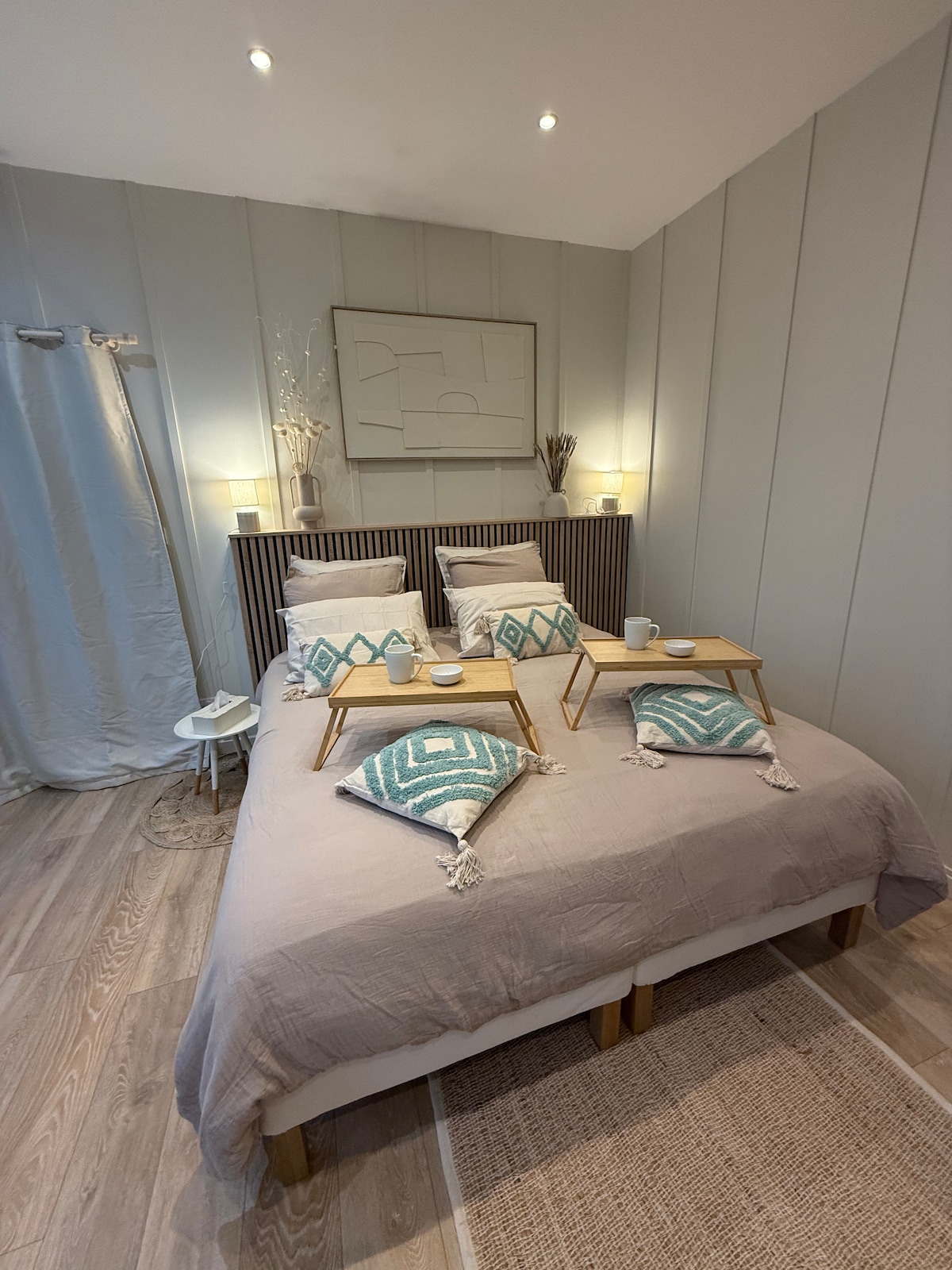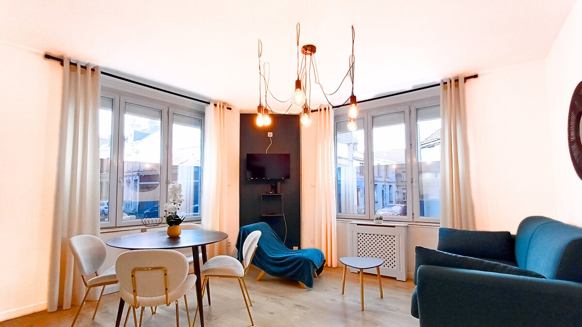Détendez vous en amoureux,entre ami(e)s dans un endroit pensé pour se relaxer. Située en cœur de ville, cette suite à la déco raffinée vous propose une cuisine équipée , un espace salon , une chambre dotée d'un lit king size avec sa tête de lit majestueuse. Cet endroit est unique car le seul de la ville à offrir simultanément table de massage professionnelle, cour privative avec hamac et baignoire balnéo 2 places alliée au confort d'une eau adoucie. Parking vélo fermé et kit bébé à disposition