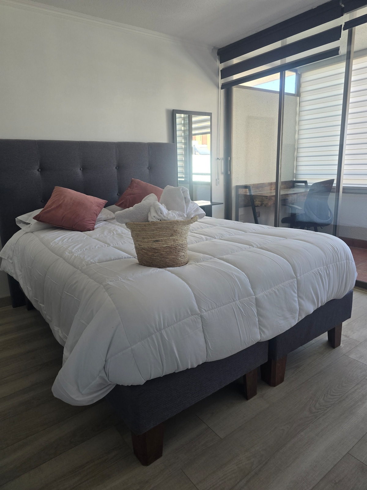 Disfruta de la sencillez de este alojamiento tranquilo y céntrico en la ciudad de Calama. Frente a él, un gran centro comercial con supermercados, farmacias, restaurantes, y otros. Renovado para entregar la comodidad y elementos que un huésped necesita. Estacionamiento privado incluído, spa, piscina, quincho, gimnasio y lavandería son los servicios que ofrece el edificio con reserva previa (cerrado los lunes por mantención en instalaciones, se debe pagar por el uso, no incluye detergente)
