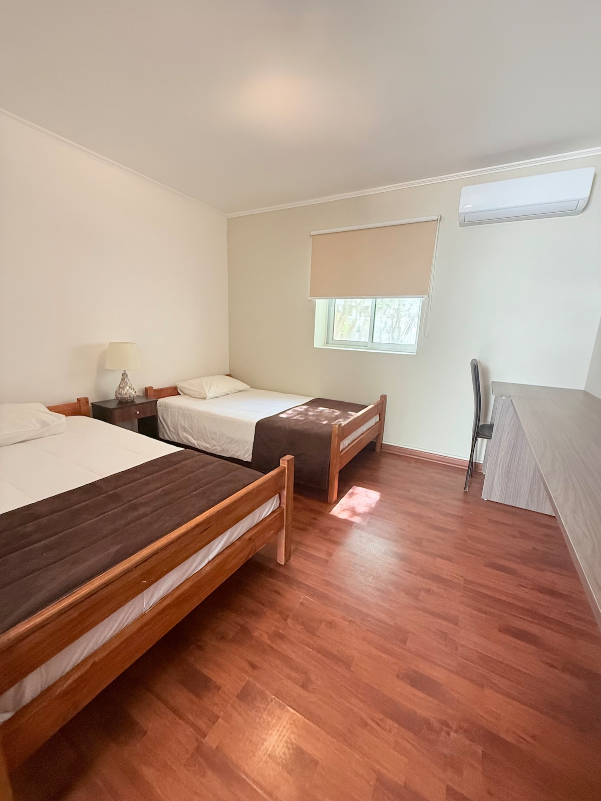 Se da factura a empresas(precio publicado más iva). Sector norte de Calama a 8 minutos del mall. Piscinas, áreas verdes, quincho, Wifi, TV, cocina equipada, lavadora secadora, estacionamiento, conserjería 24-7. 3 habitaciones: Pieza n°1: cama matrimonial Rosen. Pieza n°2: cama nido Rosen de plaza y media más colchón inferior de 1 plaza. Pieza n°3: amplio subterráneo con dos camas de plaza y media más colchón inflable de 2 plazas de buena calidad. Total personas = 8 Total camas = 6