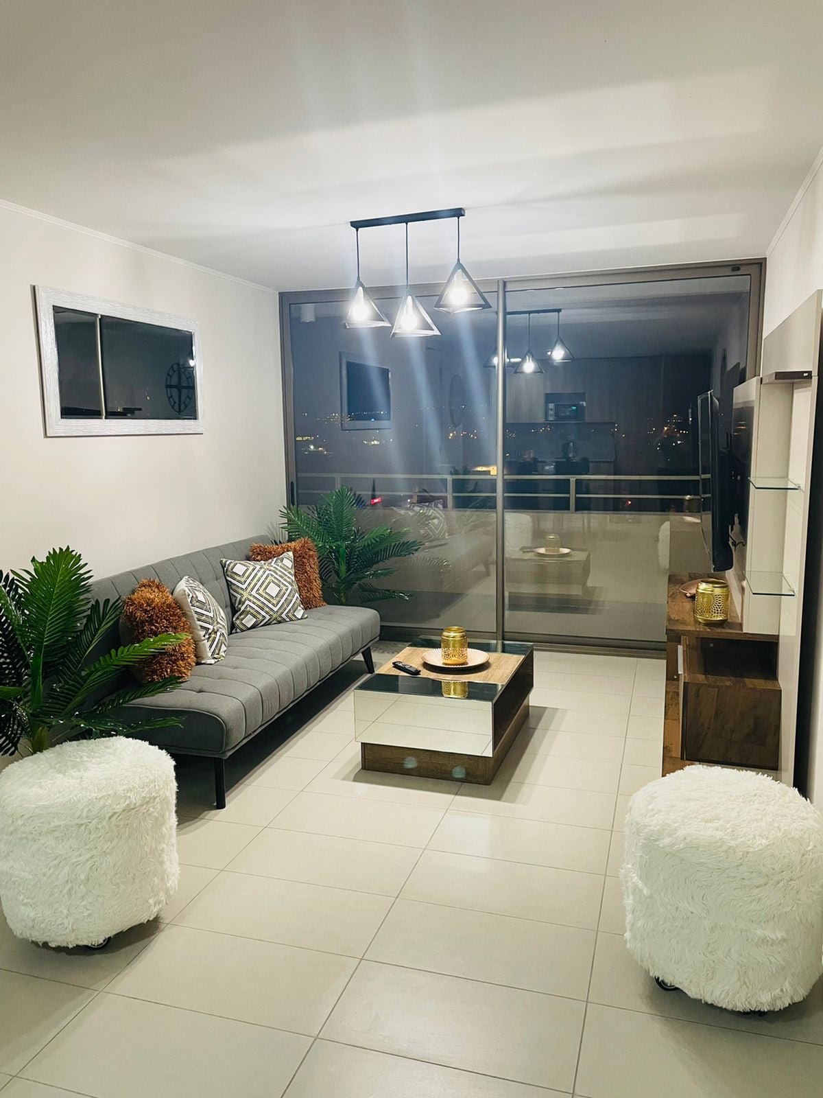 Cómodo y céntrico departamento, con hermosa vista de la ciudad. 2 habitaciones con cama de 2 plazas y baño privado, cocina americana living y terraza. Estacionamiento privado dentro del condominio. Internet WIFI y televisión por cable. Cuenta con gimnasio, quincho y piscina.