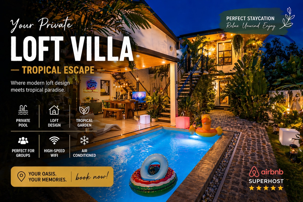 Casa Gaerlan is your private sanctuary, surrounded by lush foliage where you can escape the demands of everyday life and indulge in the serenity of your surroundings! Step outside onto your private terrace, where the centerpiece is your inviting dipping pool and stylish murals. We have a 4-bedroom villa that can accommodate up to 13 pax, making it great for family trips. We are only 10-15 mins away to Skyranch Tagaytay and Mahogany market and an hour away from Metro Manila.