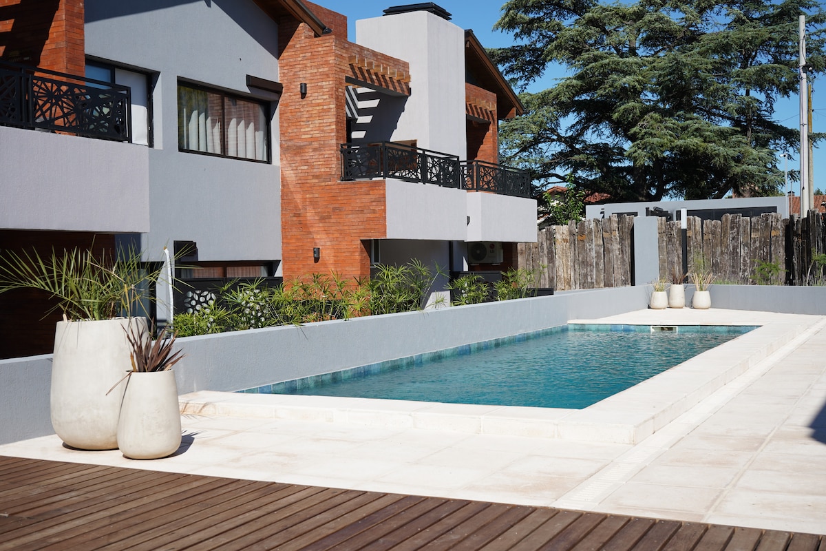 Luminoso y tranquilo departamento con piscina y cochera cubierta, a pocas cuadras del centro y a dos del arroyo. Disfruta de un balcón con vistas hermosas y una cama matrimonial, ideal para parejas. Ubicado en una zona estratégica, con todos los servicios cerca: supermercado justo enfrente, panadería, kiosco, farmacia, gimnasio, dietética y restaurantes. Perfecto para quienes buscan relajarse y disfrutar de la comodidad de tener todo al alcance, en un entorno apacible y bien conectado.