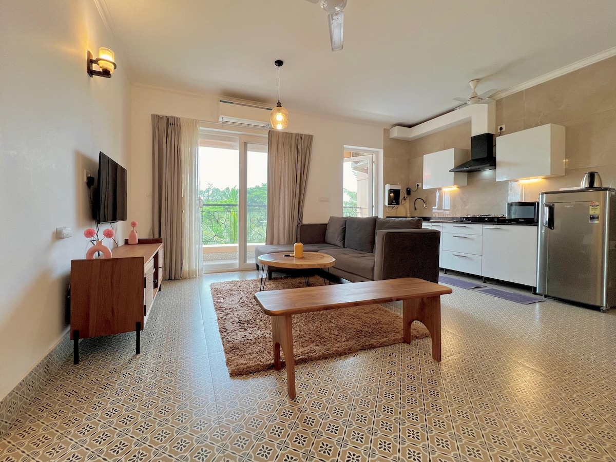 Enjoy a stylish experience at this centrally-located place.Unwind in this beautifully designed 1BHK suite apartment tucked away in a peaceful and green residential complex. Perfect for solo travelers, couples, or work-from-home stays, the apartment features a spacious air-conditioned bedroom, a cozy living area, and a fully equipped kitchen. Thoughtfully furnished and ideal for both short and extended stays, it offers a relaxed and stylish home base in North Goa.