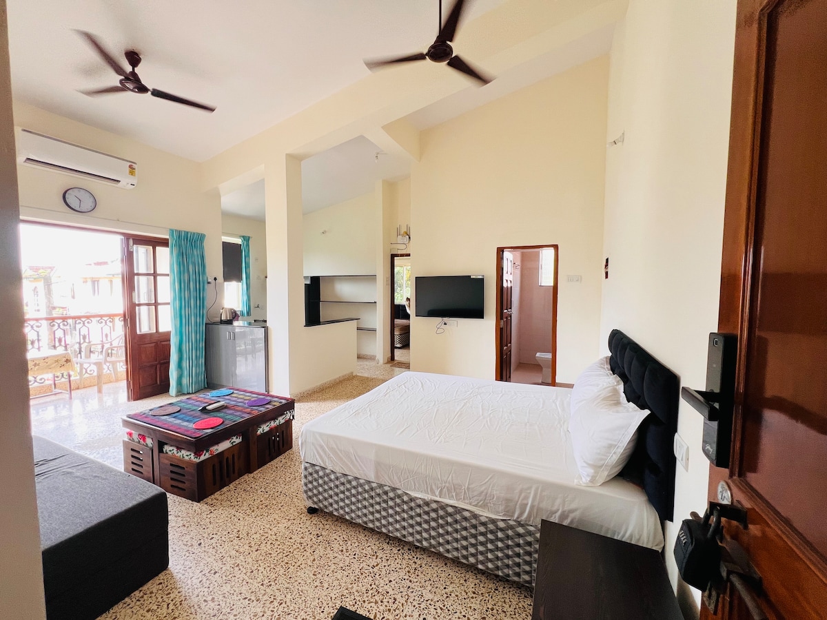 Feel welcome at the spacious Mango studio apartment with kitchen. With the famous and vibrant Calangute - Baga beach just a two minutes stroll away, play as much as you want in the sand and sea! The studio with minimal, cozy and natural design is the perfect spot to relax and lounge after your day of Goa adventures. It also has a private porch to enjoy the tropical garden.