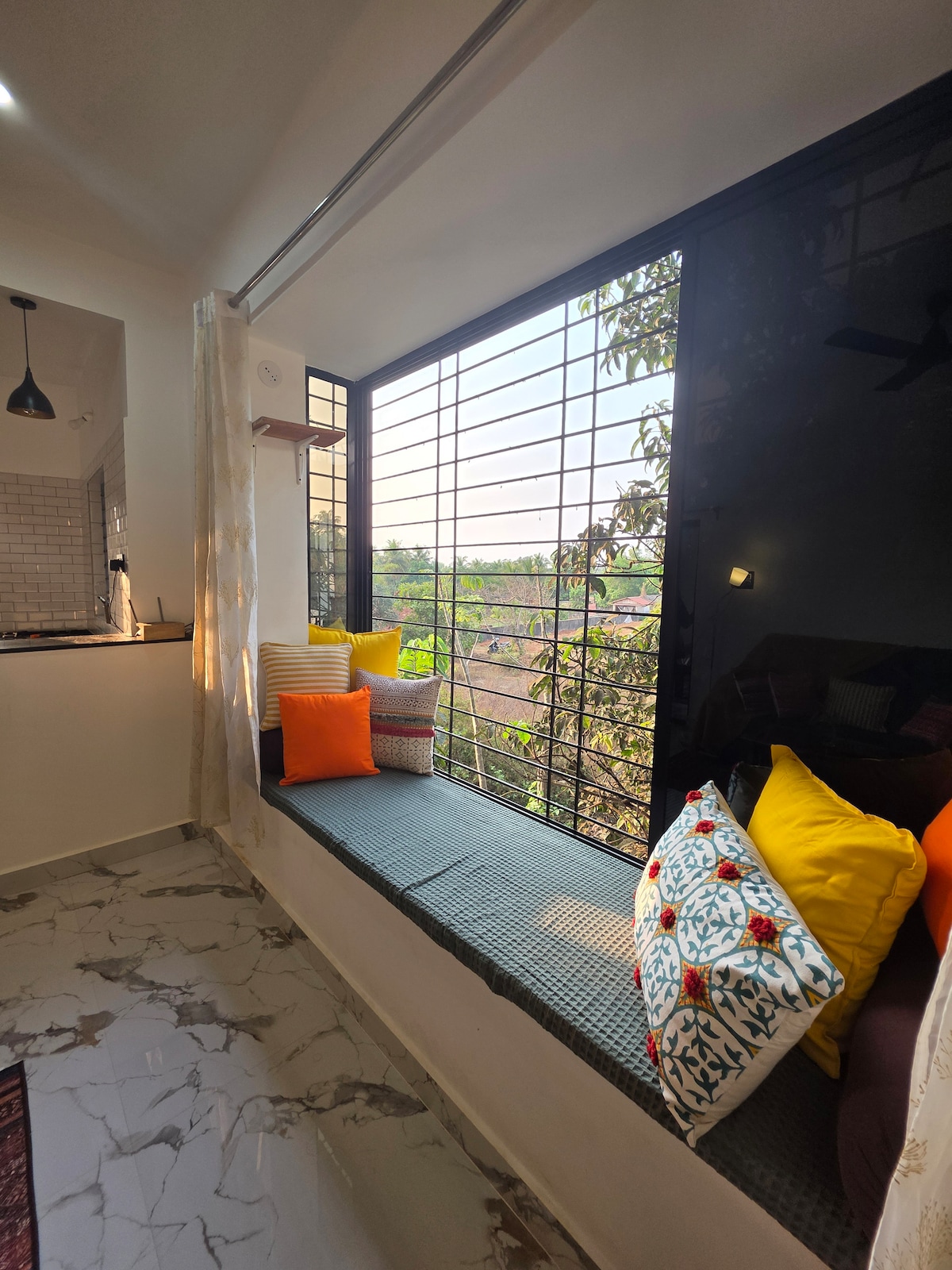 Stanza is a little slice of the "Slow Goa" life. It’s a bright, colorful 1BHK that sits right in the green covers of Ashwem. The space is filled with handmade decor and art personally curated by the host - so it feels warm and lived-in rather than a generic hotel room. ​The best part? You don't have to deal with traffic to get to the beach. There’s a wooden bridge used by the village that takes you straight to the sands of Ashwem Beach.