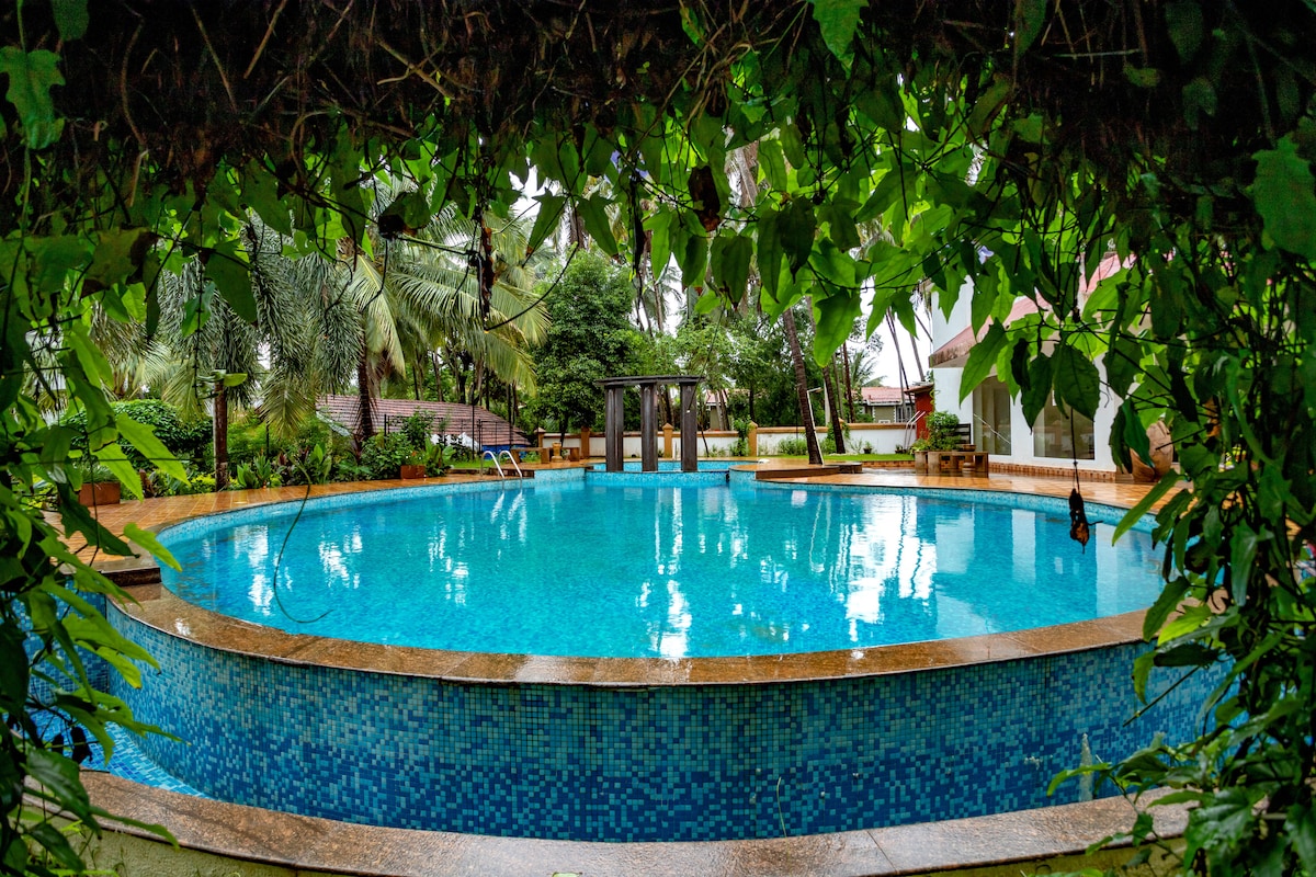 Experience Goa's Vibrant Nightlife in Baga,Calangute! Just a 7-min ride to Baga Beach & Tito's Club. Enjoy: - 2 Pools & Jacuzzi - State-of-the-art gym with steam & sauna for wellness - Fun game room with Pool, carrom & more - Serene landscape garden for relaxation Suite features: - Well Lit Deluxe Room - Plush king-size bed with luxury linens - Pvt Covered Parking - LED TV with popular OTT platforms for entertainment - Lightning-fast WiFi for seamless connectivity - Inverter Power Backup