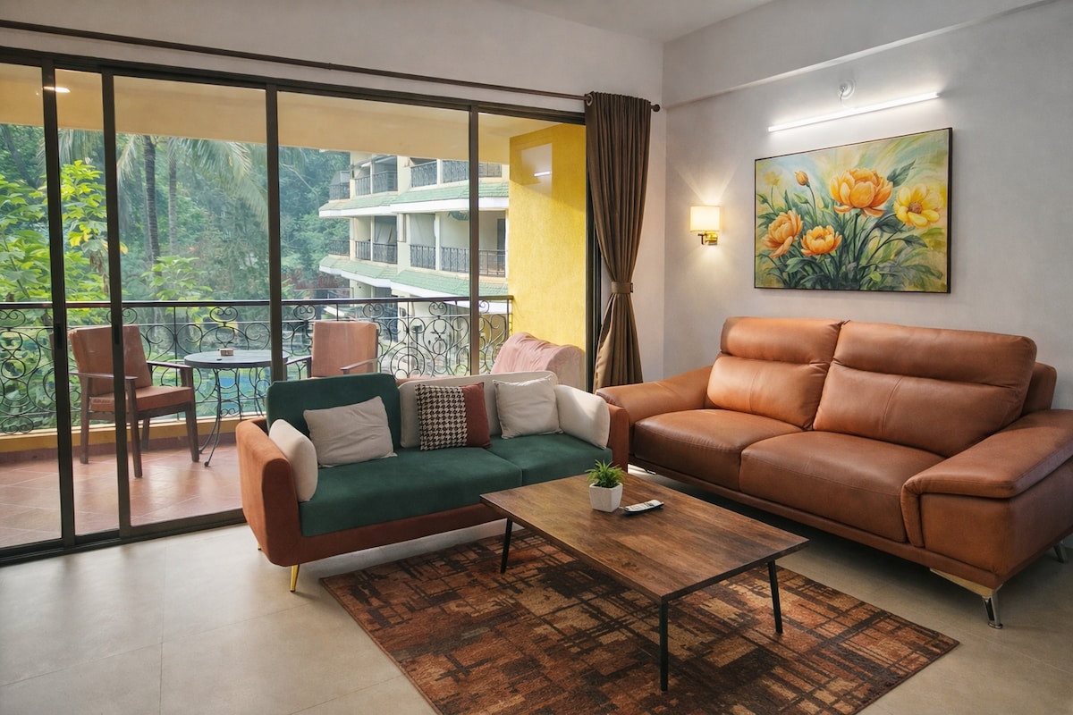 1BHK Tropical view Apartment in Candolim Enjoy a relaxing Goan getaway in this bright and Luxury 1BHK apartment with a balcony overlooking the tropical view and lush green courtyard. The space is designed for comfort, style, and convenience perfect for couples, families, friends or solo travelers. What You’ll Love: Fancy Bedroom Cozy Living area Spacious Dining area Fully equipped kitchen Spacious bathroom Access to Swimming pool, GYM and Yoga centre ,Pool table. Reserved parking