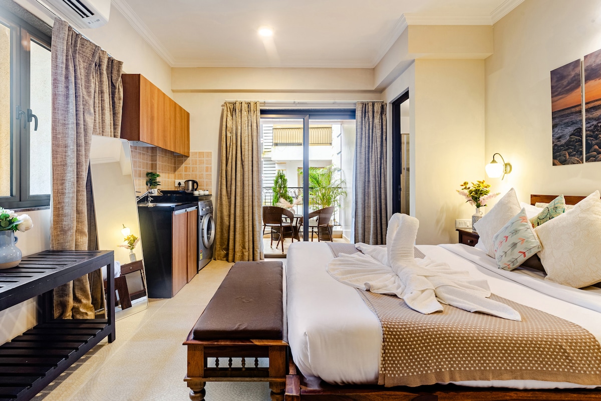 Tucked away in the charming and green village of Siolim, this thoughtfully designed 1BHK flat offers the perfect blend of comfort, style, and serenity for travelers seeking a true Goan experience. Whether you’re a couple on a romantic getaway, a solo explorer, or a digital nomad, this cozy space is designed to help you unwind and recharge. the apartment is part of a gated community with 24/7 security, a swimming pool, and lush landscaping. High-speed Wi-Fi makes it easy to stay