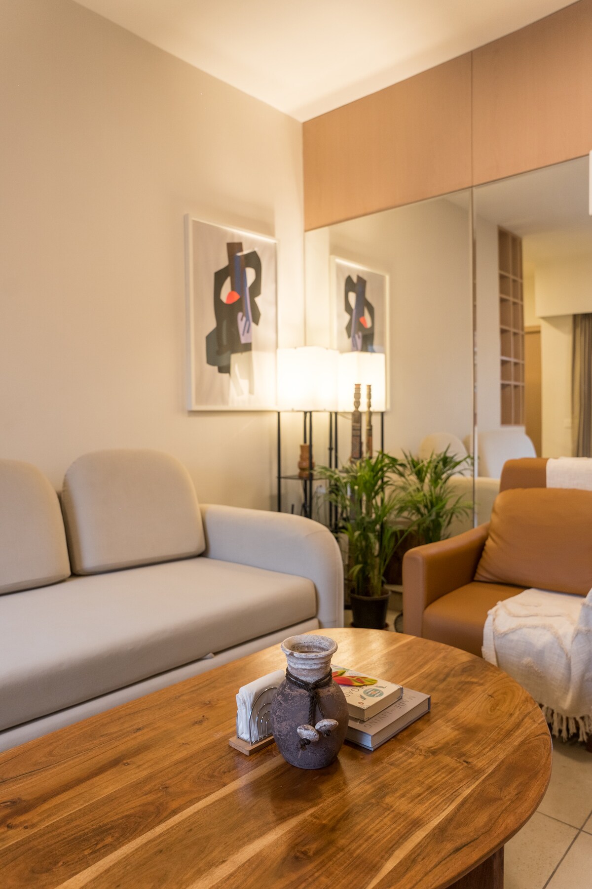 Welcome to our home that is curated with all our love, for you to feel the serenity and luxury that we experience too. Nestled in a quaint ‘Waddo’ in the otherwise hustling party beach area in North Goa, our apartment fills all its rooms with natural light and cool sea winds that open up into a refreshing green expanse. Make yourself feel at home in the large living room with a fully equipped kitchen, the two earthy yet vibrant bedrooms with attached baths and a large-private sit out space.