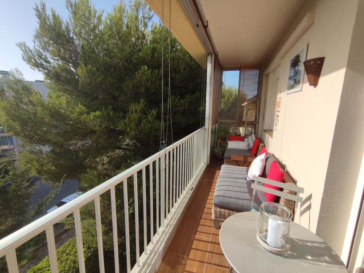 Dans une résidence calme, à 300 mètres du Port de la Madrague, de la plage, des restaurants, des commerces, profitez d'un deux pièces avec terrasse, exposition sud, vue sur la pinède et aperçu mer. parking privatif. Nous avons soigné la décoration et l'équipement afin de rendre votre séjour le plus agréable possible. Vous disposerez de la fibre et d'une box TV. Appartement idéal pour une famille de 4 personnes (deux adultes et deux enfants)mais aussi pour un couple. LOGEMENT NON FUMEUR