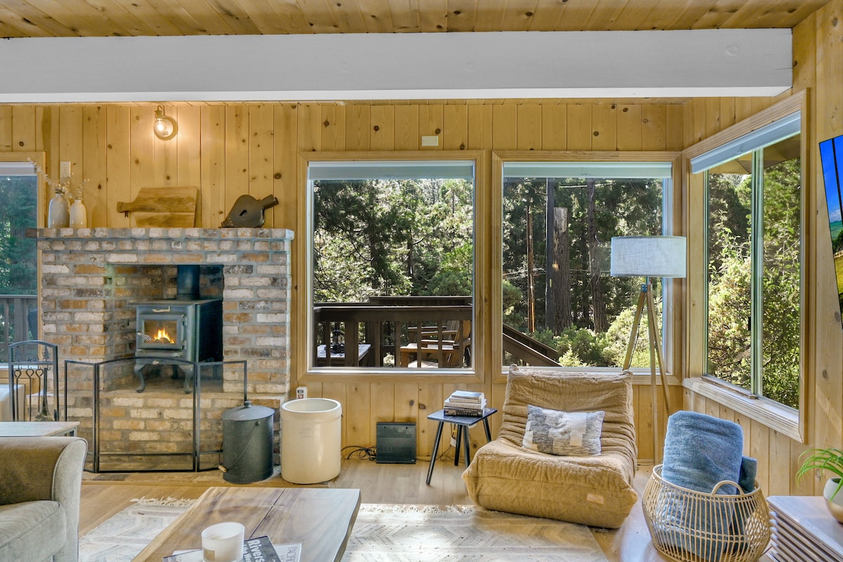 The smell of redwoods, burning woods, hot chocolate. Chirping birds, rustling of deer in the forest. And cozy blankets make a weekend in the woods the best place to be. The Stylish Treetop Cabin in the woods is a design gem among the treetops with rustic décor, fab art, soft cozy linens, relaxing hot tub, sauna & plunge pool. The cozy cabin is well equipped and is perched up in the treetops, close to hiking, dining, skiing/snowboarding, wine tasting, golf, pools and nearby lakes.