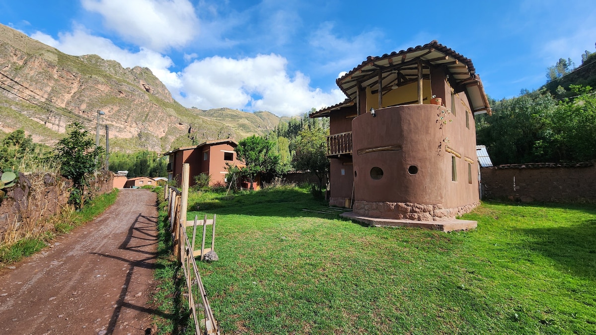 Casa ecológica nueva, amplia e iluminada. Localizada en el corazón del Valle Sagrado, a 5 min del centro de Urubamba y 20 min de Ollanta. Rodeada de montañas y con un riachuelo que pasa dentro de la propiedad. Cama King size, espacio para yoga o trabajo, balcón y agua caliente solar en cocina, baño y ducha. Ideal para reconectar con la naturaleza sin renunciar al confort. Hecha con amor, pensada para tu bienestar. ¡Te esperamos!