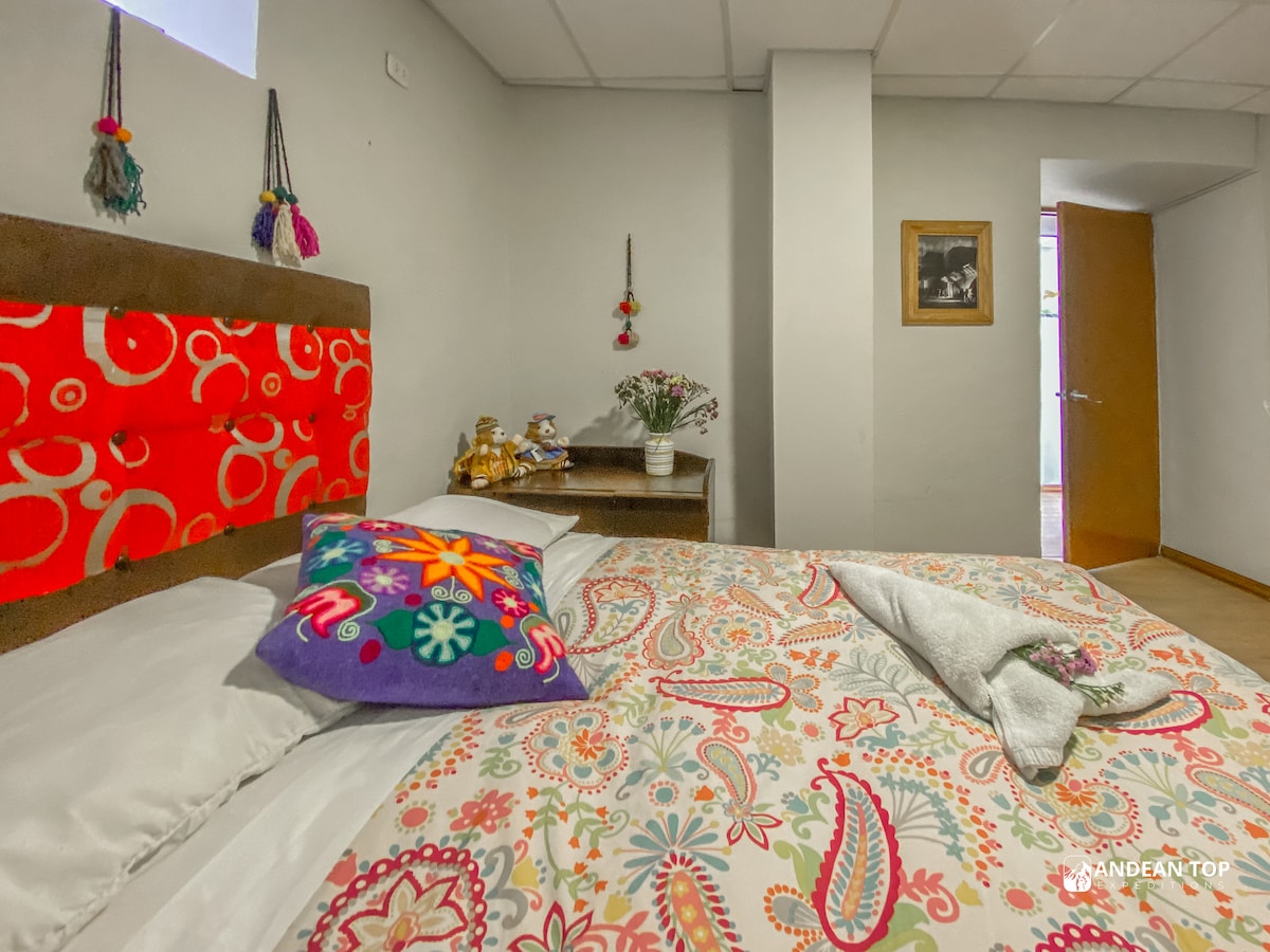 Departamento amplio y acogedor, con excelente vista y tranquilo, cerca a la plaza y diferentes miradores. Cuenta con baño privado, ducha caliente, sala espaciosa para reuniones o para pasar tiempo con familia o amigos con una cocina y un comedor, cuenta con dos habitaciones y 3 camas (una habitación matrimonial y la otra doble), con vista al Cusco. Ideal para pasarla con amigos o tu familia