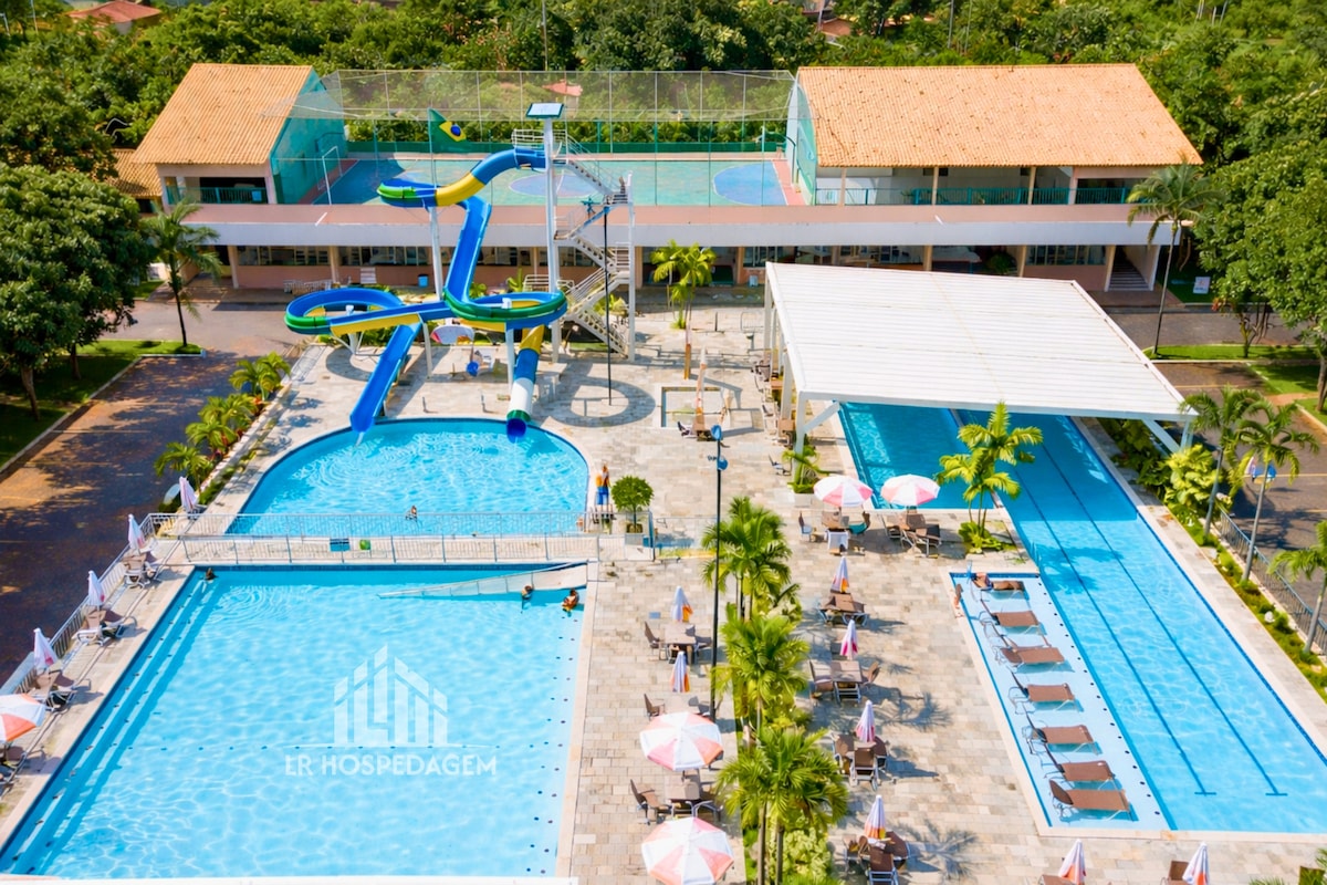 EXCELENTE APARTAMENTO COM VISTA PARA O PARQUE AQUÁTICO. Suíte com cama box Queen, ar-condicionado, TV, armários, criados e cortina com black-out; Quarto com 2 camas box (+ 02 auxiliares), criado, ar-condicionado, e cortina com black-out; Banheiros com armários e box no banho; Sala com sofá, TV de tela plana, aparelho de dvd, mesa com 6 cadeiras, bancada com 2 banquetas, ventilador de teto; Cozinha tipo americana com fogão, geladeira inox, micro-ondas, sanduicheira e utensílios. Área de serviço.