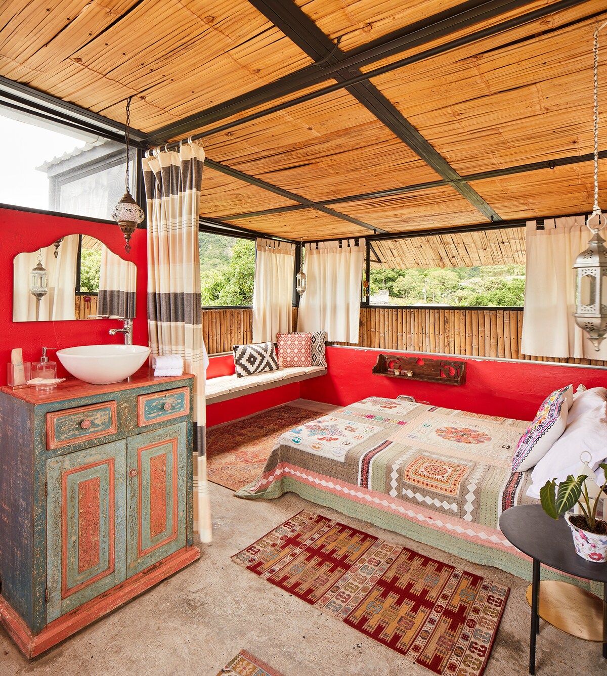 Habitación Marrakech es una habitación doble en B&B Casa Amberes. La habitación cuenta con una cama doble y su baño privado al aire libre (solo hay agua fría) y una terraza con asoladores. Esta ubicado en la terraza de la casa (3 piso). Por la mañana ofrecemos el desayuno lo cual está incluido en el precio. Ofrecemos almuerzo, cena y servicio de bar por un costo adicional. Los huéspedes tienen acceso a las zonas comunes como la piscina, la sala y comedor.