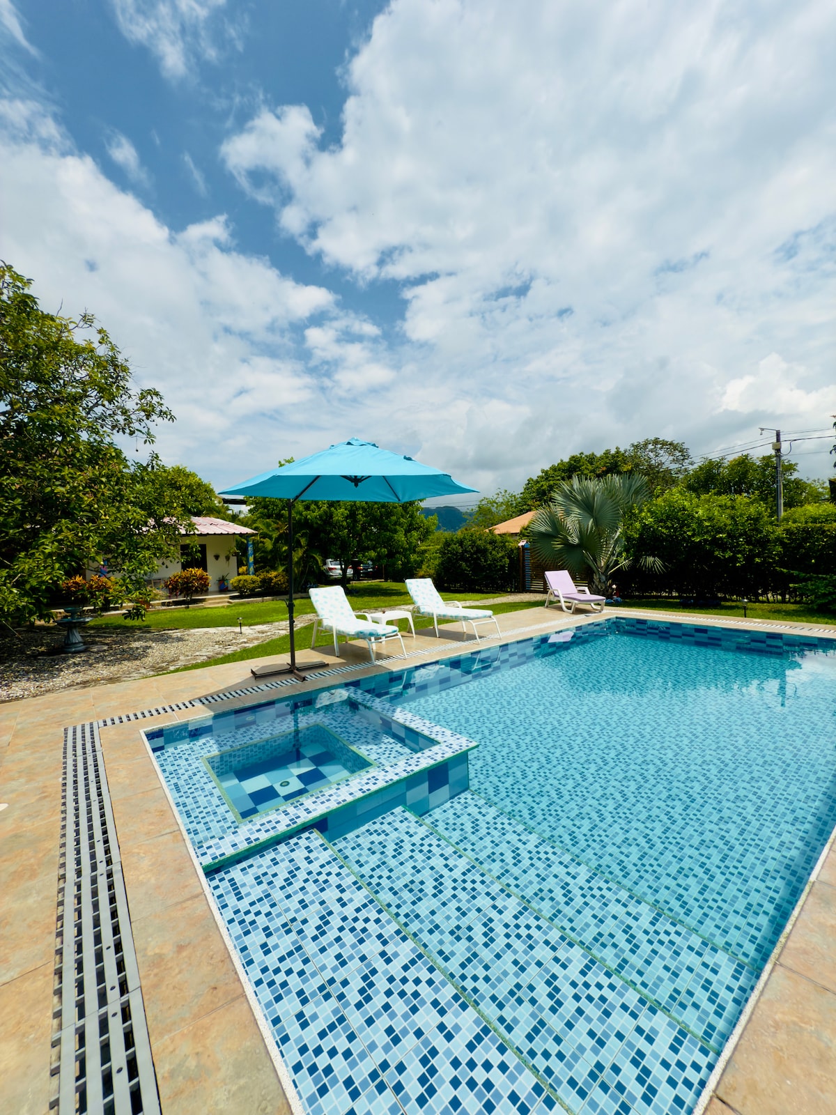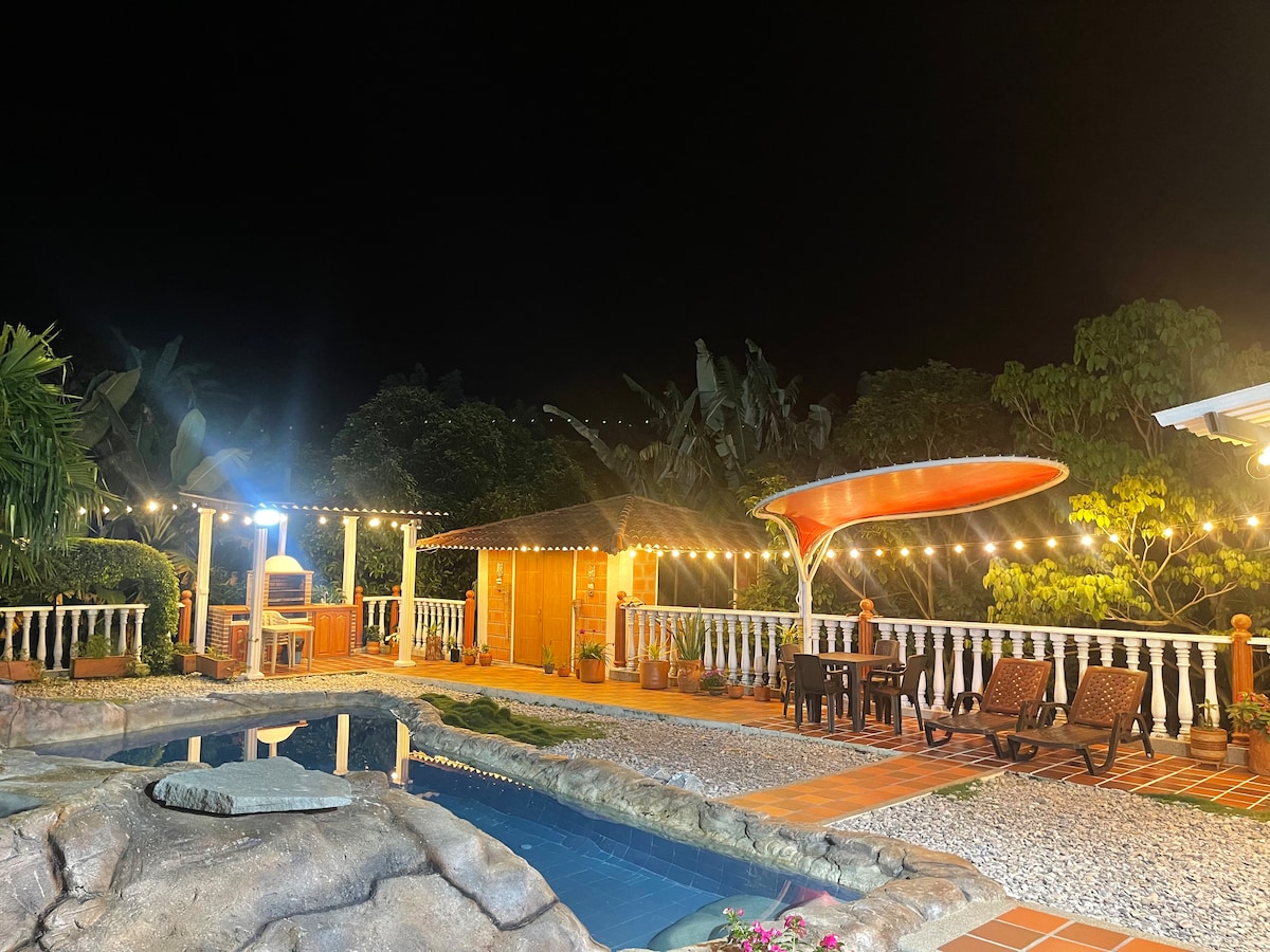 Private villa in the heart of Colombia’s Coffee Region, perfect for families and groups. Enjoy a private pool, jacuzzi, outdoor social kiosk, and two fully equipped kitchens one open-air Surrounded by lush gardens and mountain views, WiFi, a BBQ area, and comfortable bedrooms.Just 1 hour from Pereira Airport,close to Parque del Café, Panaca, Salento, Cocora Valley, Nevados National Park,Santa Rosa Hot Springs. Fully equipped, with an optional local cook for meals extra costYour perfect getaway